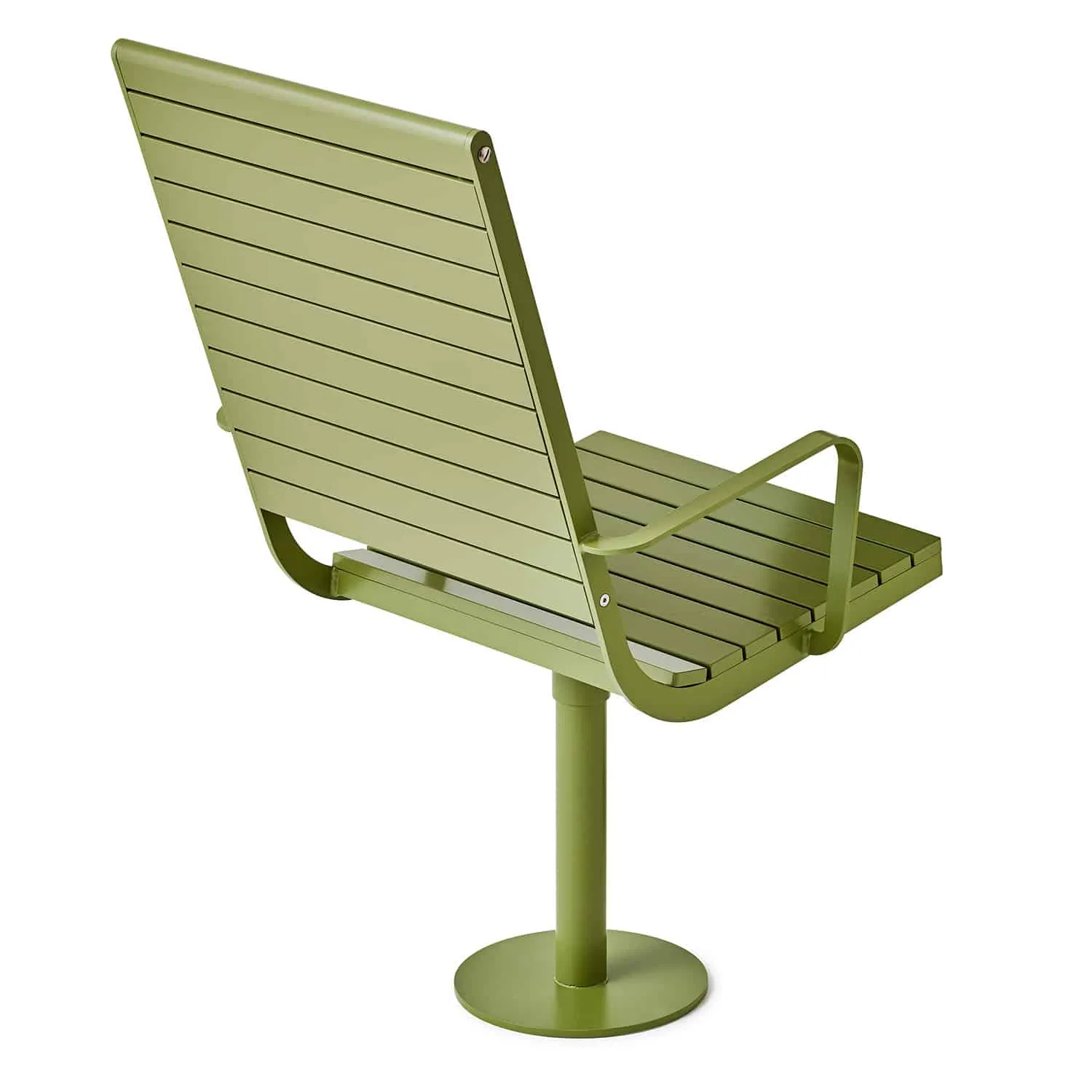 The newest addition to the Parco furniture group is a lounge chair, a sleek swivel seat that is difficult to walk away from. It joins a series of products that create unique seating combinations and outdoor dining arrangements. Made with comfort in mind, the swivel lounge chair is a spacious design with an angled seat and backrest that encourages those seated to sit back and relax. Placed alongside other Parco seats, the swivel lounge chair forms part of a comfortable arrangement of outdoor seating. All Parco products can be ground-mounted, providing fixed furniture for indoor areas, public spaces and outdoor environments.