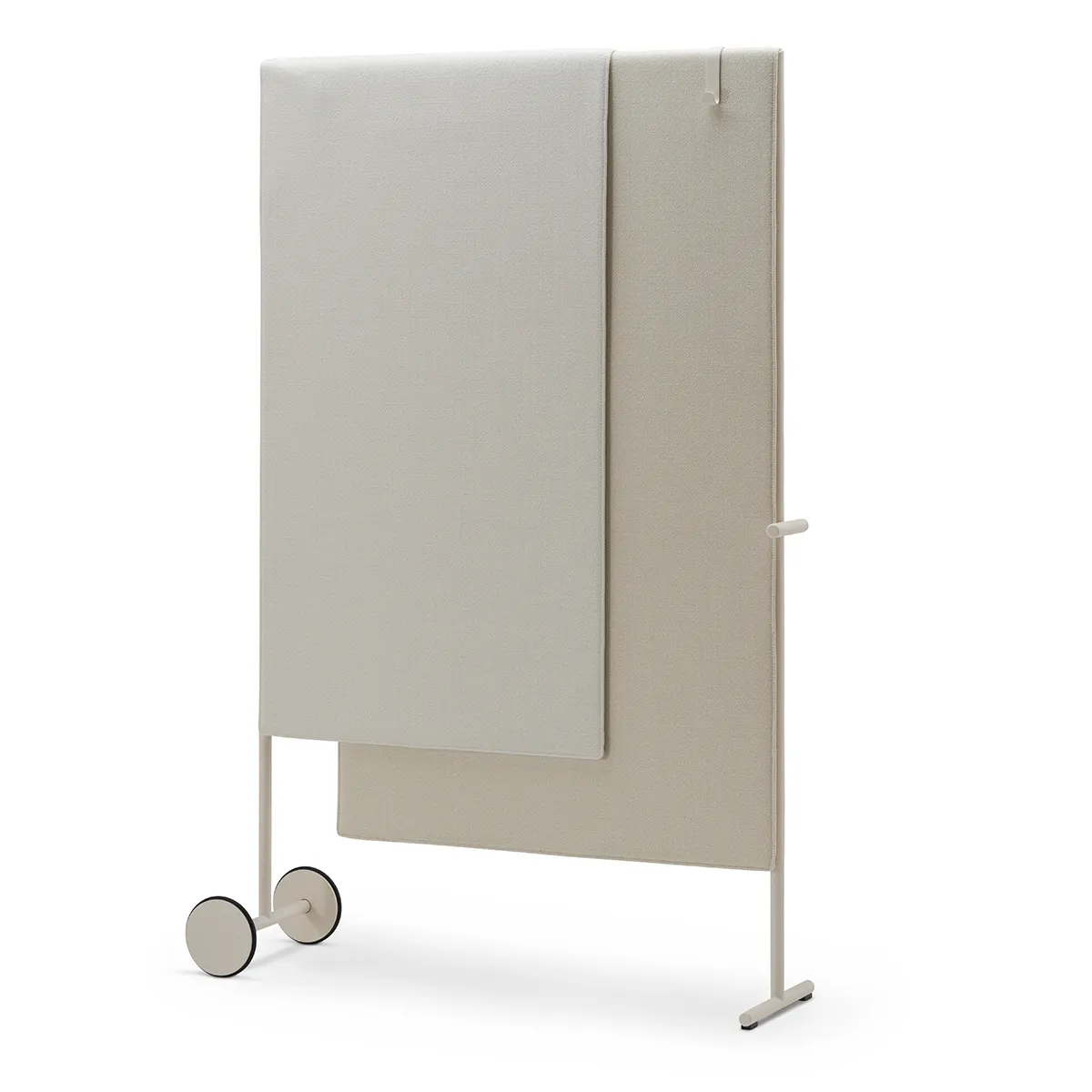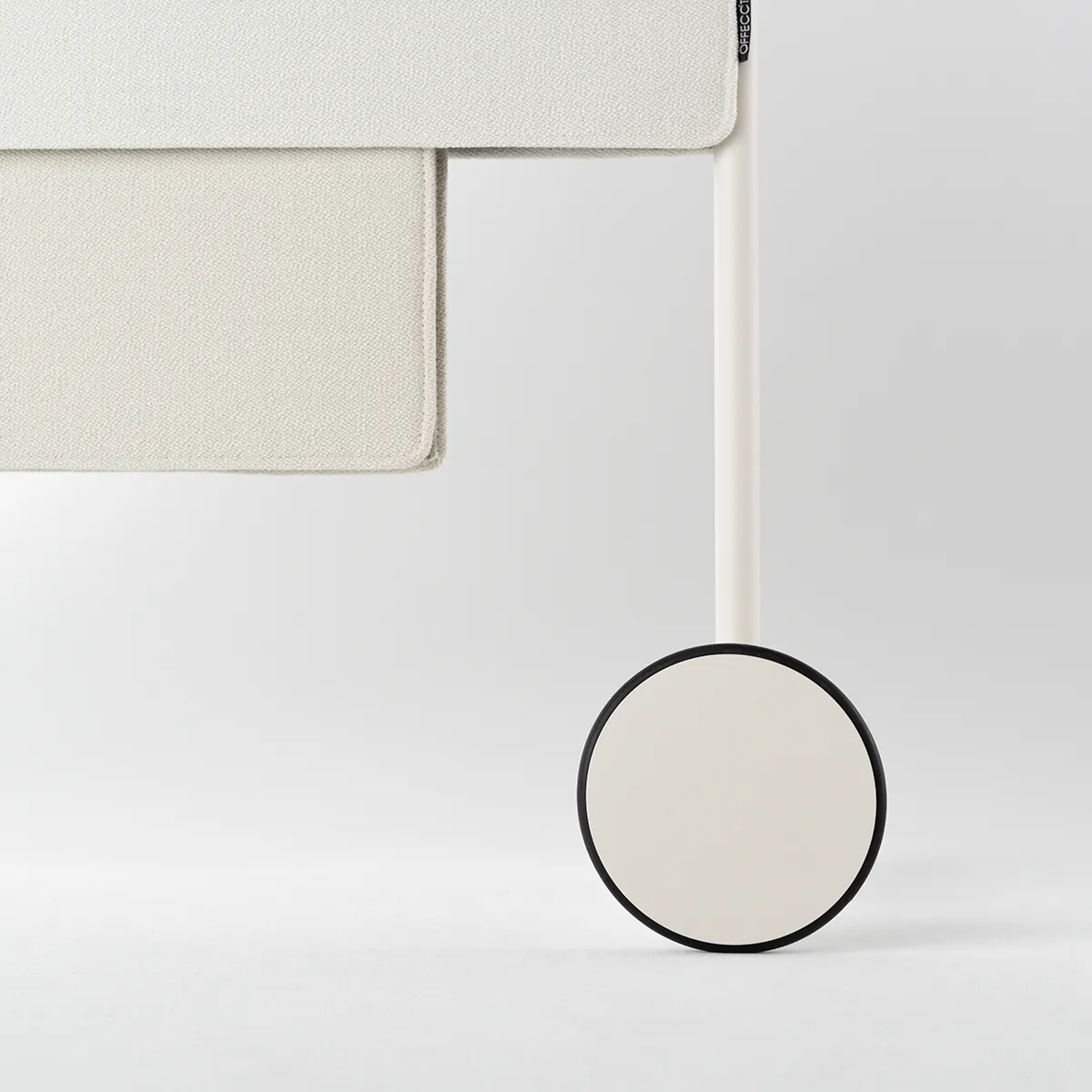 Acoustic room divider upholstered in textile. Frame and wheel in lacquered metal. Black