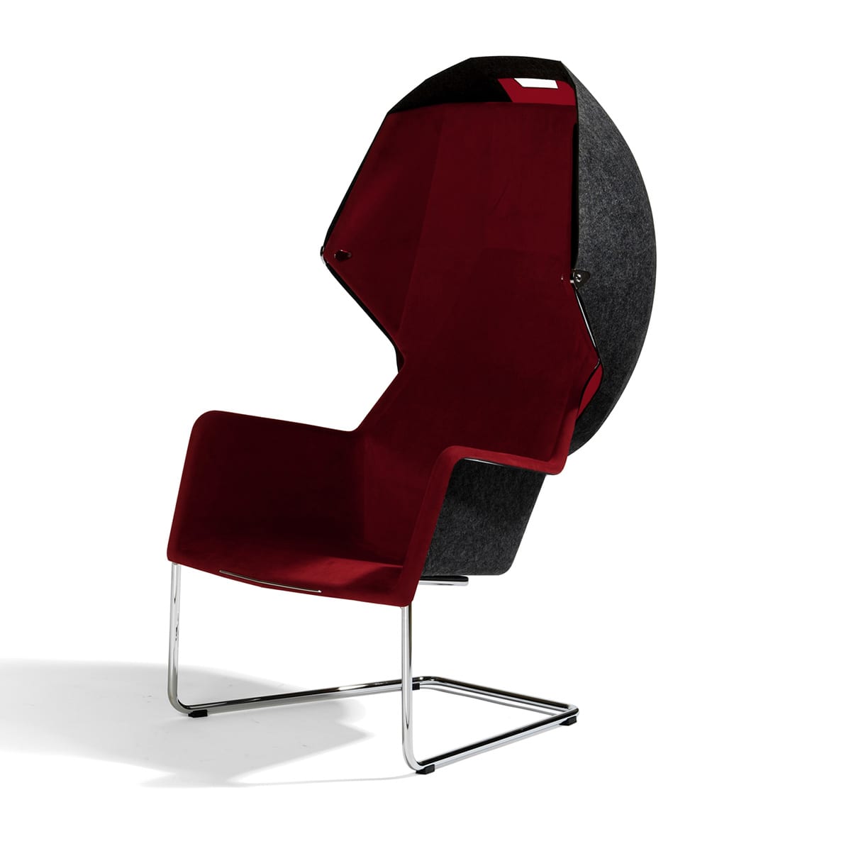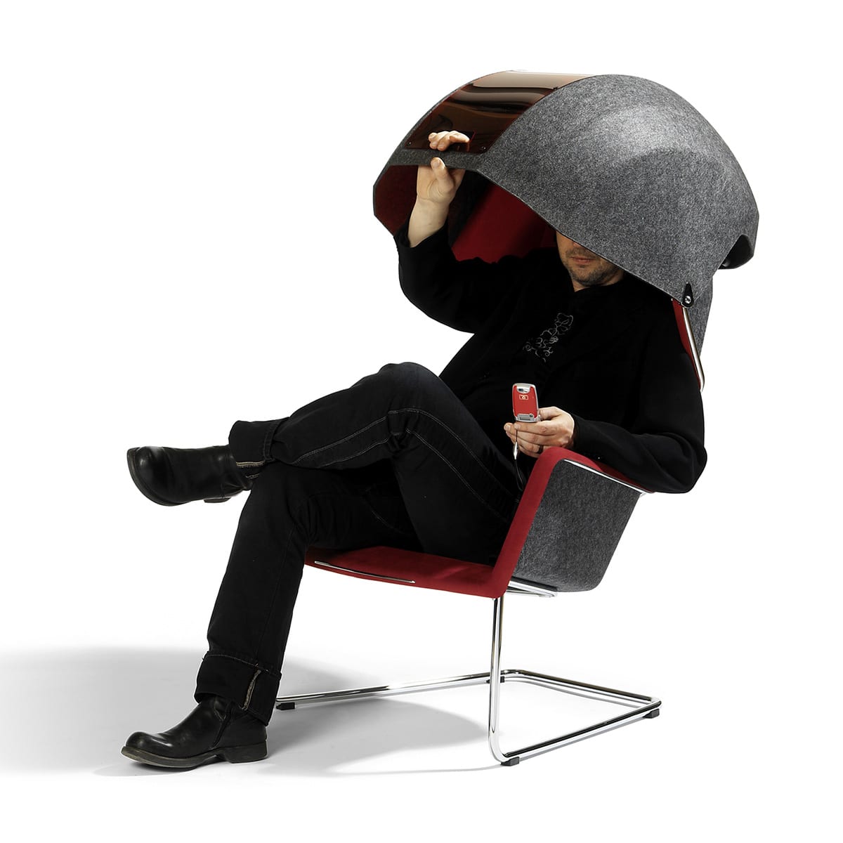 The Peekaboo wing-chair that was shown for the first time last Stockholm Furniture Fair 2005, a modern wing-chair with a possibility to add a hood in formfelt (the material is in itself sound absorbing) to create a small oases, a small room of your own.