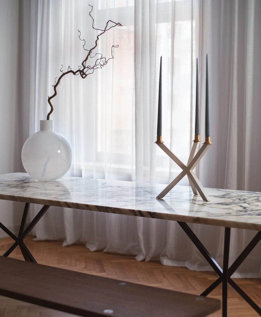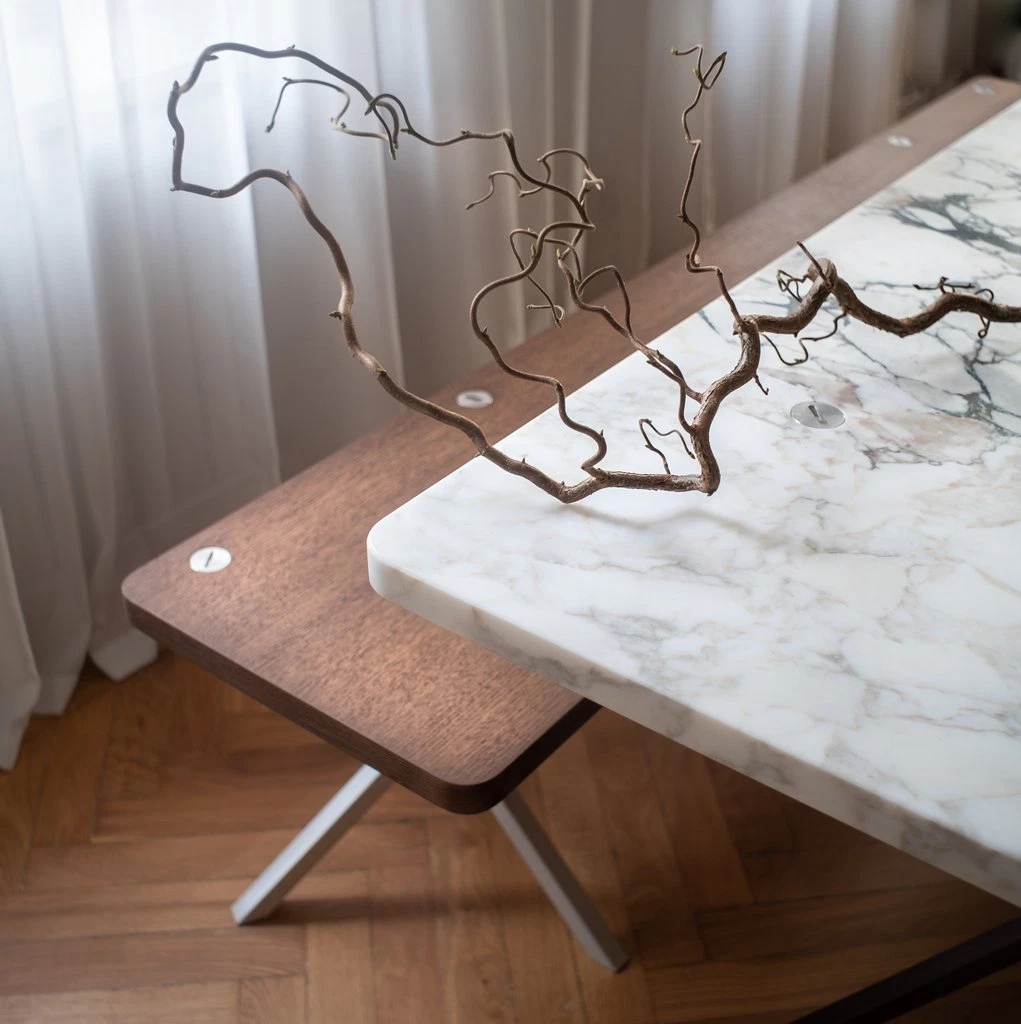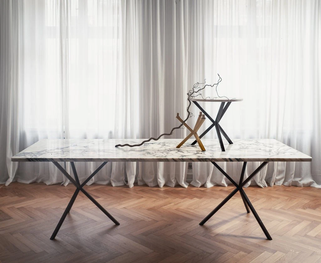 What defines the Bespoke Collection is its relationship to material. Rather than selecting a material to serve a predetermined design, Söderberg reversed the process: starting with a slab of Calacatta marble, one of the world’s most sought-after stones, he drew each piece directly from what that particular slab offered. Because Calacatta is characterised by a pronounced dark grain against a white ground — and because every slab is unique — no two pieces in the collection are identical.
