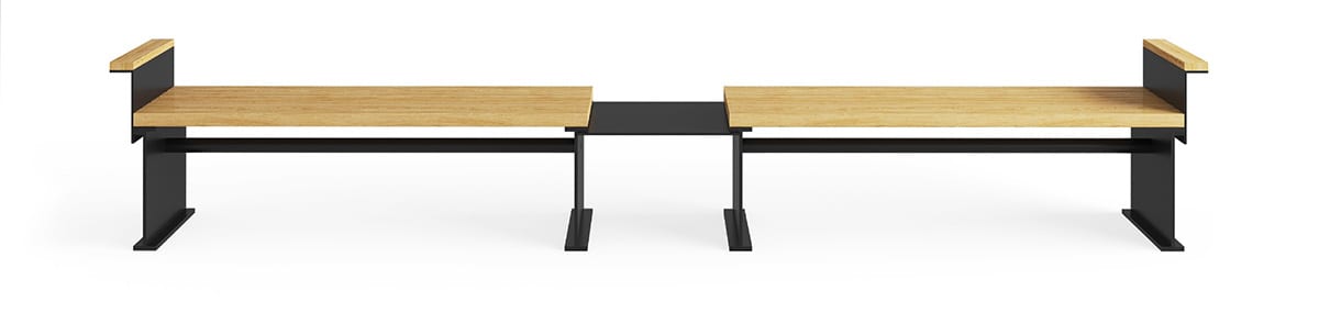 As its name suggests, the Perpendicular park bench is formed by components aligned at concise angles. Sleek wooden slats form a seat and backrest positioned at angles that make seating more comfortable and ergonomic. The steel parts join together without any visible welds, giving the bench a sleek appearance. The benches can be complemented by optional tabletops on either side. With its streamlined proportions and sleek details, Perpendicular is a perfect complement to modern architecture. The park bench and backless bench, together with the side tables, can be interconnected to form lengths in a variety of sizes and configurations.