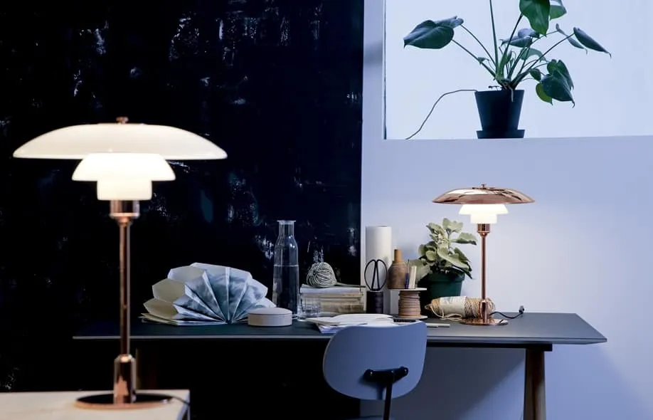 The PH 3½-2½ copper table lamp is 46 cm tall. A practical height providing good working light with either type of shade. The three-layer opal glass shades are polished on the outside and sandblasted on the inside. The switch is located on the cord.