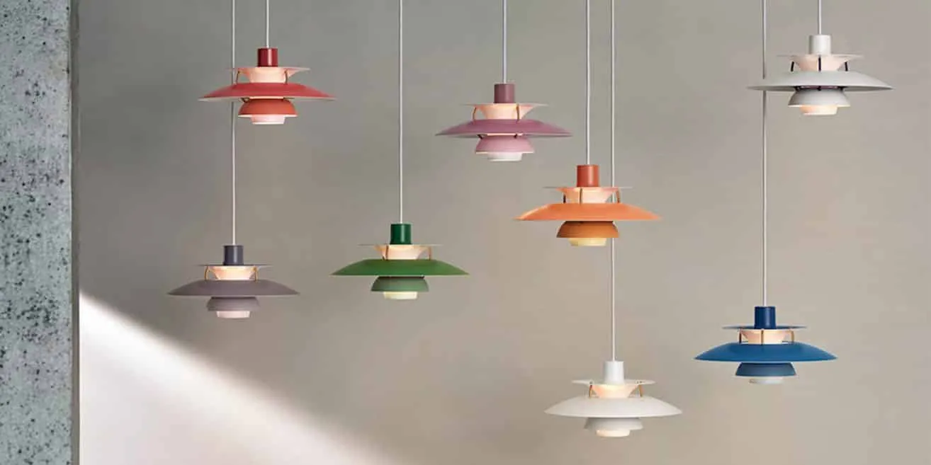 The new PH 5 Mini is introduced in an innovative new colour palette, developed in collaboration with colour expert Louise Sass and plays with colours that start with the darkest tone at the top and soften shade by shade.