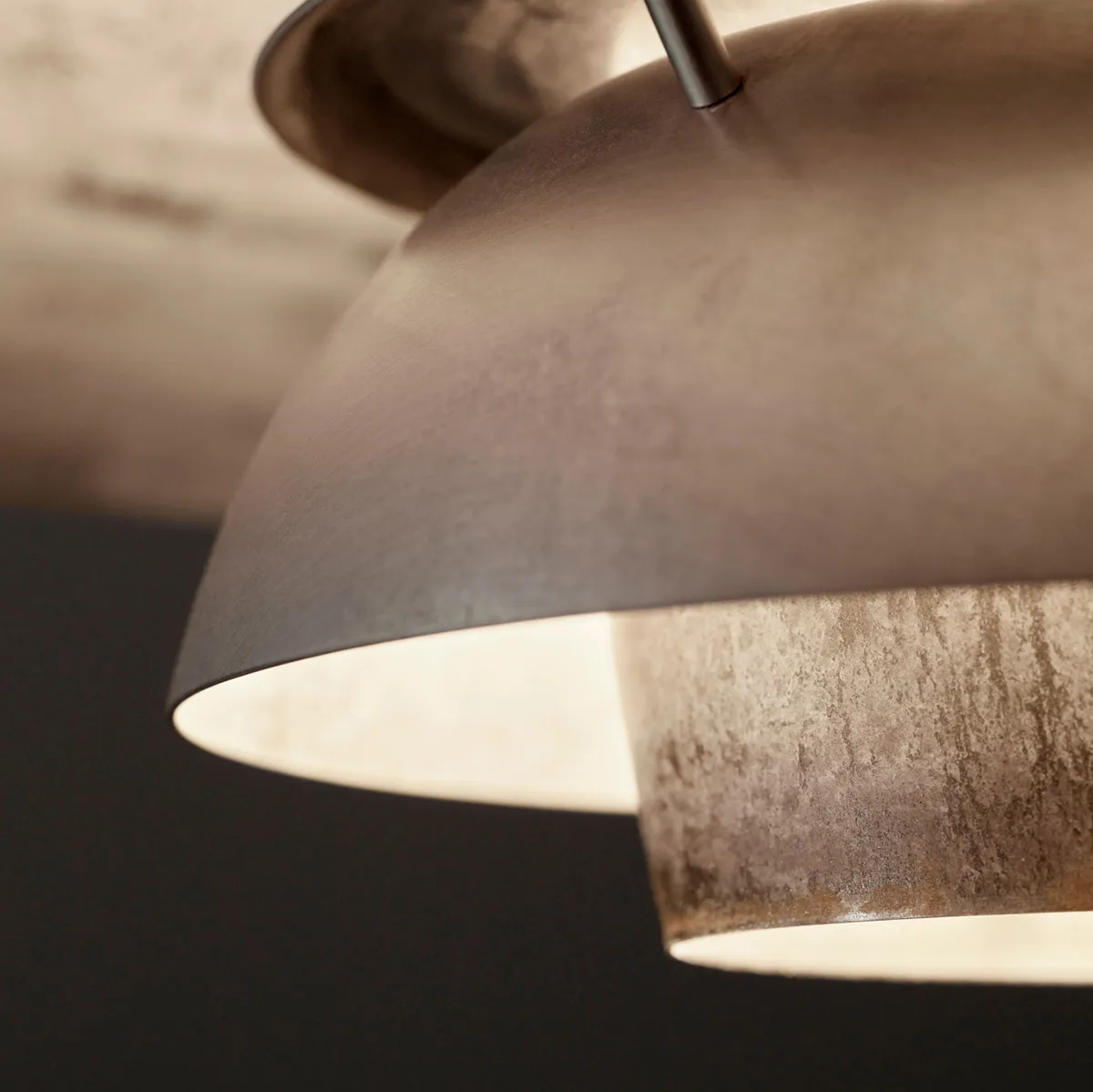 The fixture is a retake on a classical PH 5 and has been stripped of all its previous paint, thus appearing raw and untouched. The bare metal inner shades give a particularly gentle light reflection, delivering a warm and cosy ambience. The lower shade is furthermore fitted with a frosted diffuser glass to ensure that the downward directed light is 100% glare-free.