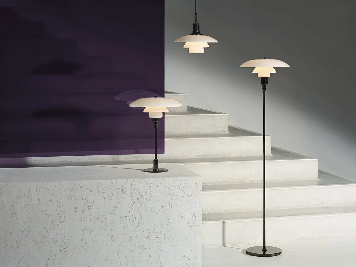 The extensions include both new PH 2/1 and PH 3½-2½ lamps with white opal glass and a chrome or black metallised frame. The industrial look of the dark metallised surface offers a bold, understated look. The mouth-blown white opal glass shades soften the overall look of the lamp and illuminate its surroundings with a perfect, harmonious and glare-free light that only the classic three-shade system is capable of emitting. The shades are mouth-blown three-layer opal glass, which is glossy on top and sandblasted matt underneath to provide soft and uniform light distribution.