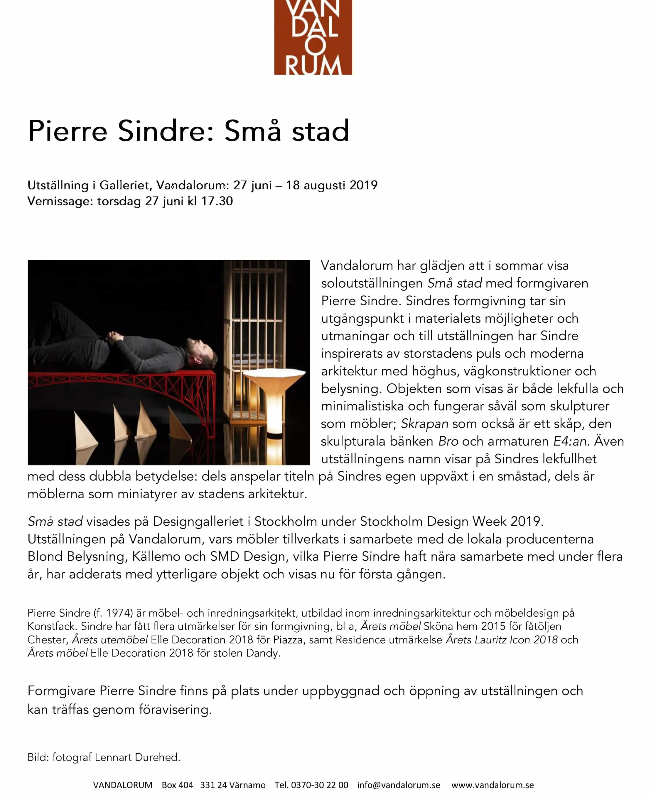 Pierre Sindre exhibition “Små stad” @ Vandalorum 25 June, 2019 Exhibition 27/6–18/8 VANDALORUM Box 404 331 24 Värnamo Tel. 0370-30 22 00 info@vandalorum.se www.vandalorum.se Follow on Facebook