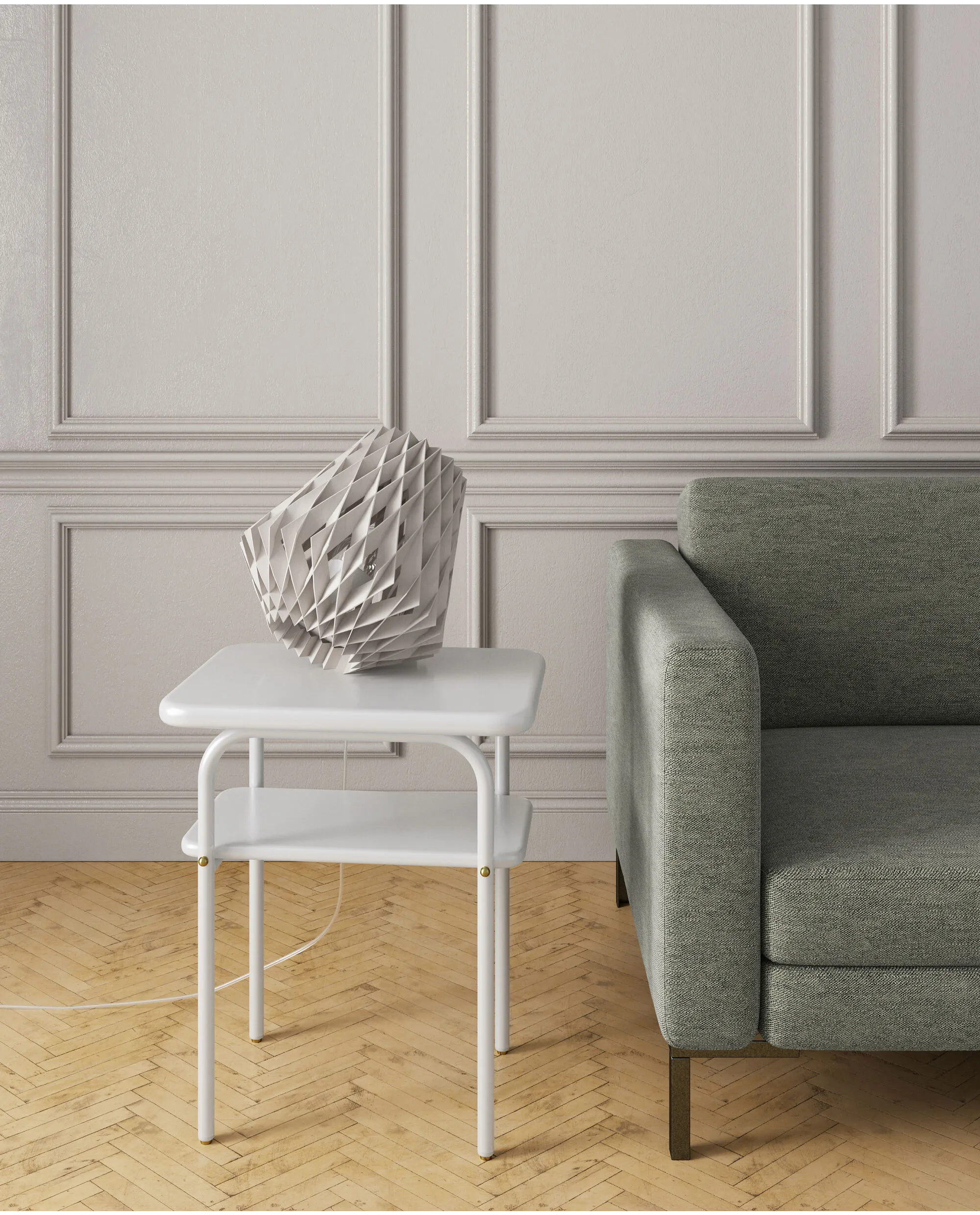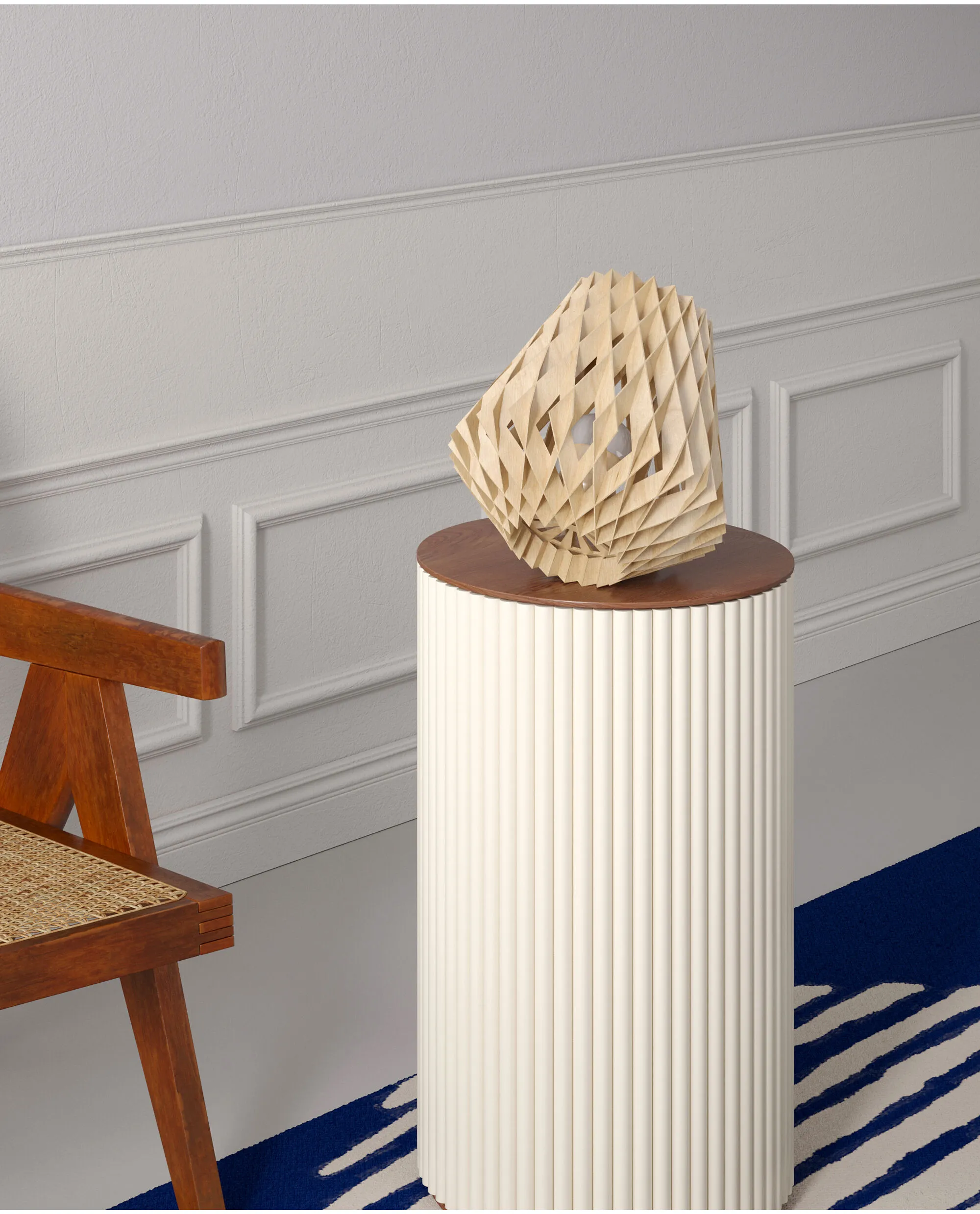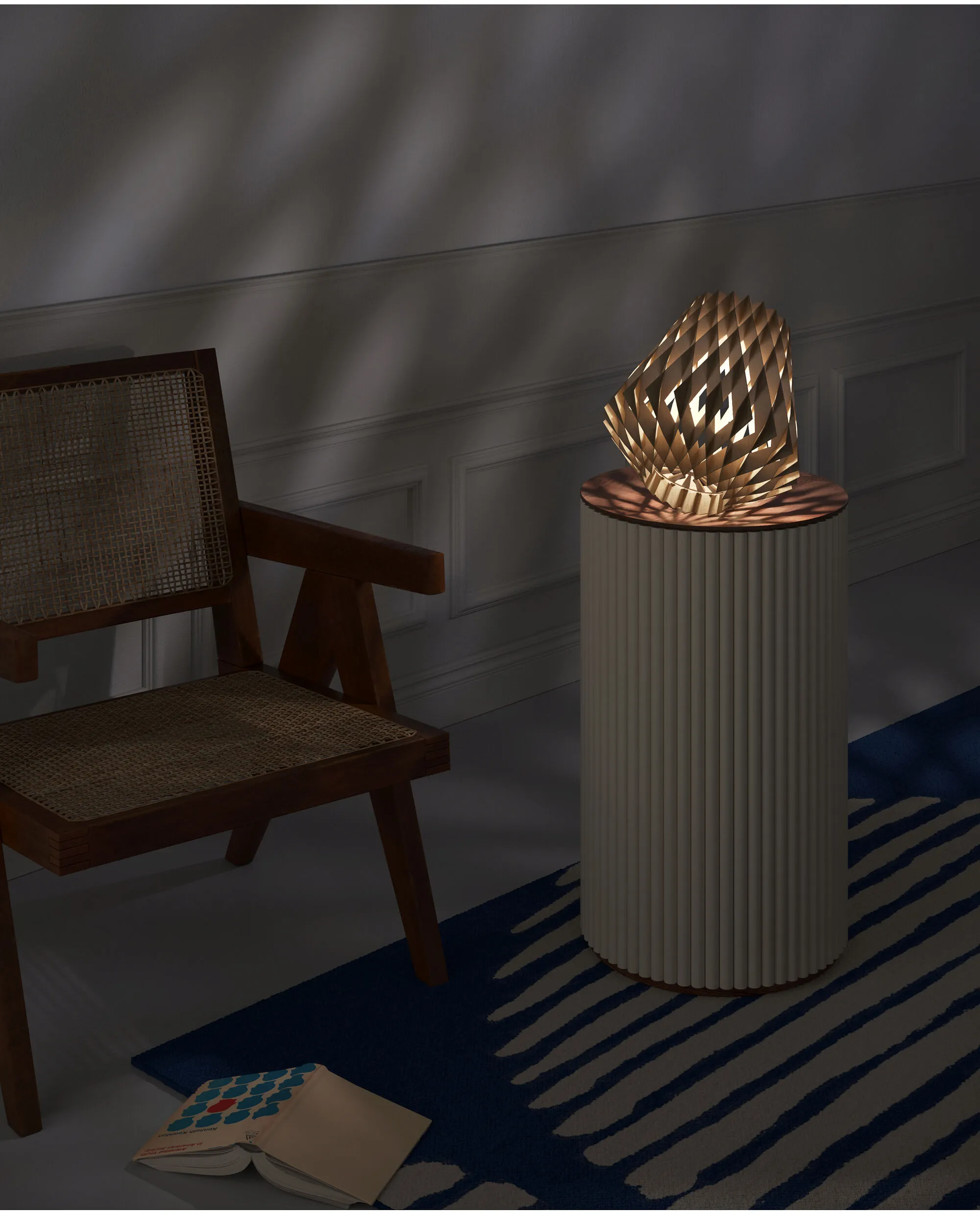 The stylish geometric design and natural, sustainable wood bring warm glow and wellbeing to your life. Traditional Finnish shingle work remastered by today’s computer technology enables assembly without using any glue or screws. Handcrafted in Finland.