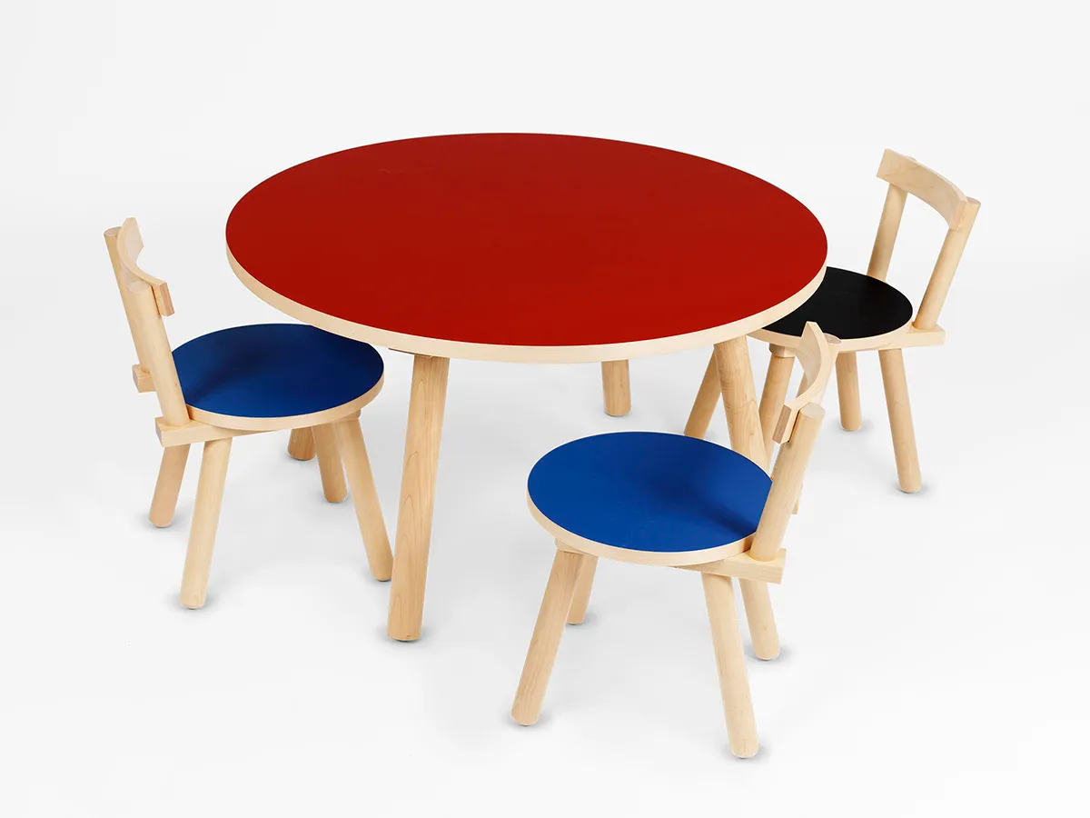 Childtable. Birch natural, linoleum tabletop. h. 50, diam. 90, 110,130