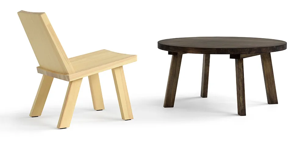 David Ericsson’s sturdy little punk of a chair welcomes three low tables in different sizes and forms. There is also a new stylish addition that is a reversible seat cushion in leather and suede upholstered with natural felt.