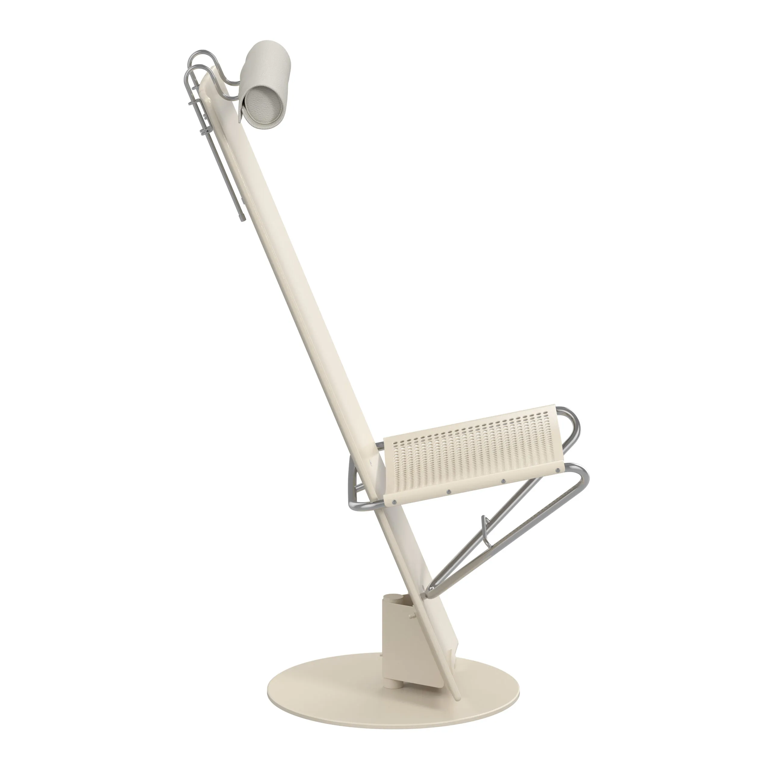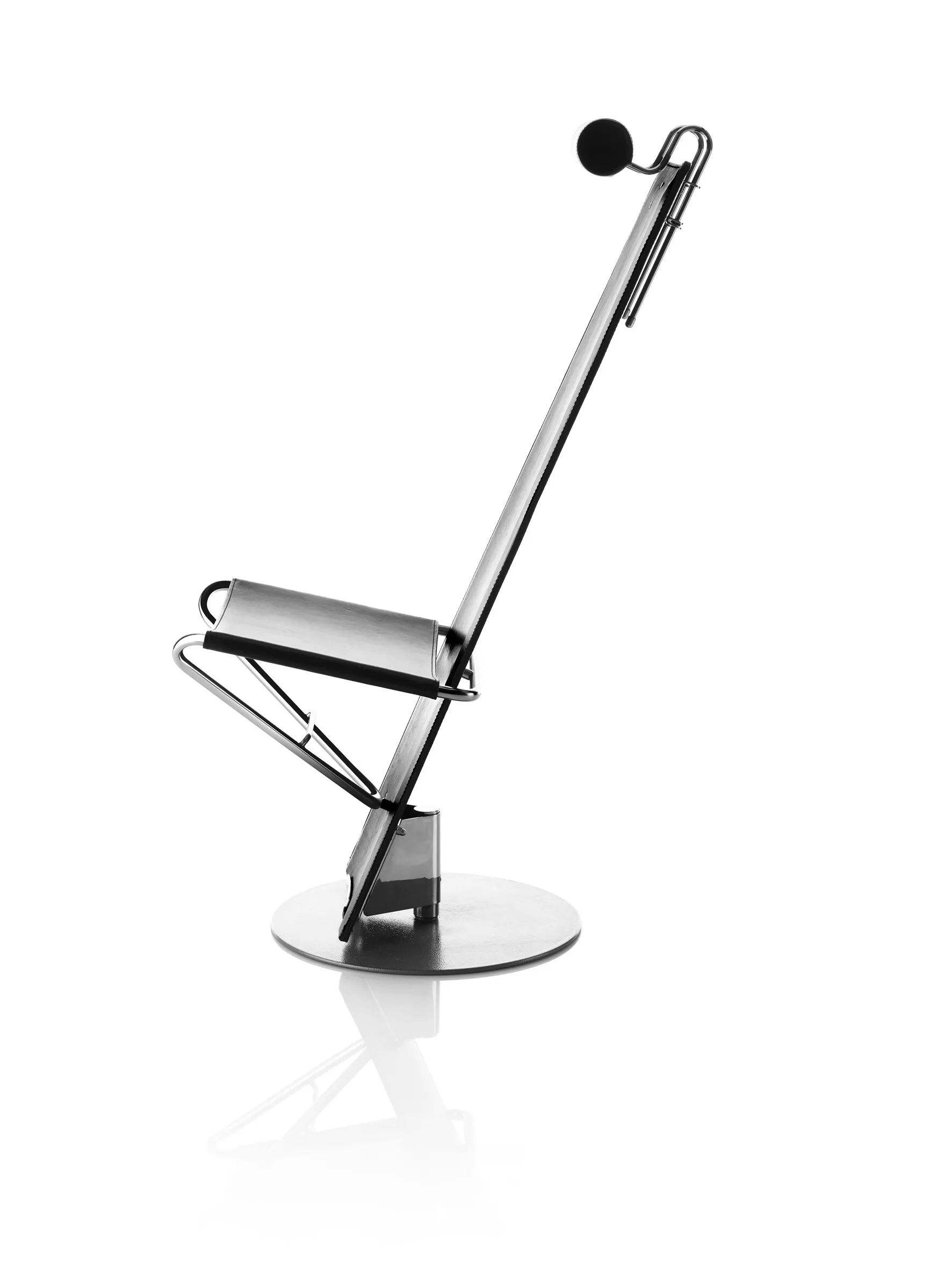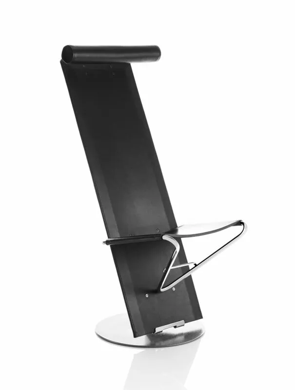 Swivel base. Foot plate of powder coated steel. Polished chrome tubing support. Back of lacquered wood alt. upholstered in black or natural coach hide leather. Seat of perforated sheet metal or upholstered in black or natural coach hide leather. Adjustable neck cushion in leather or fabric.