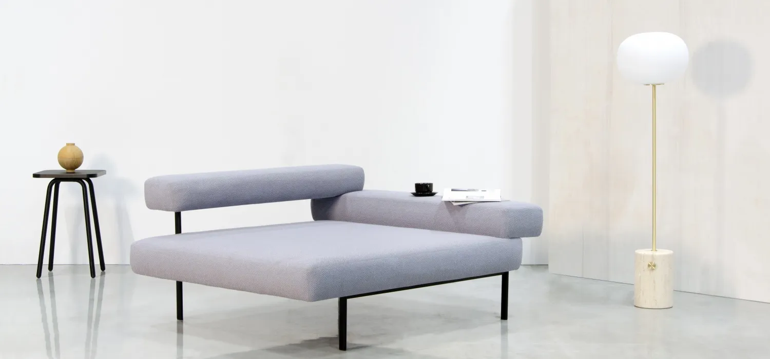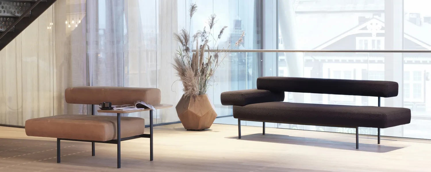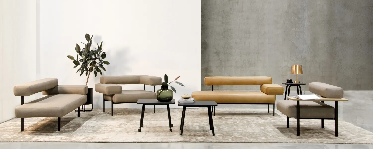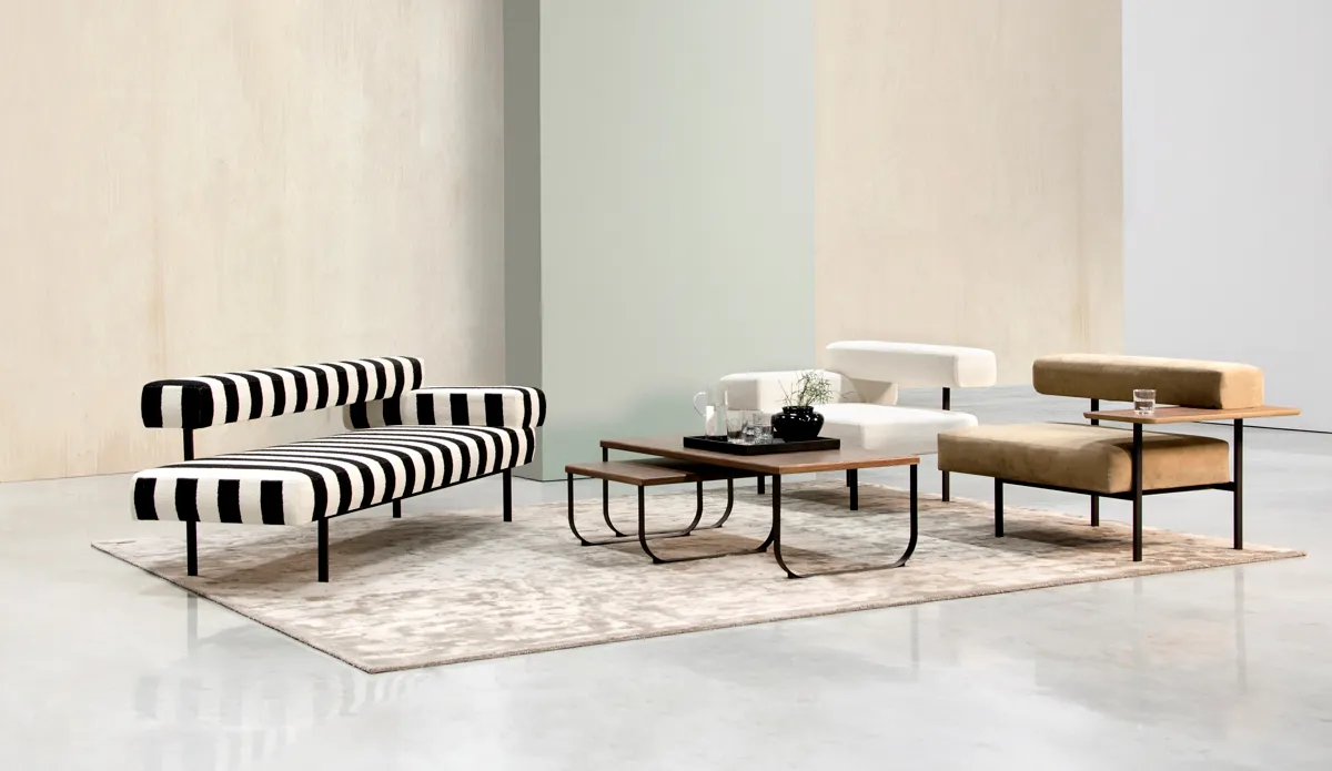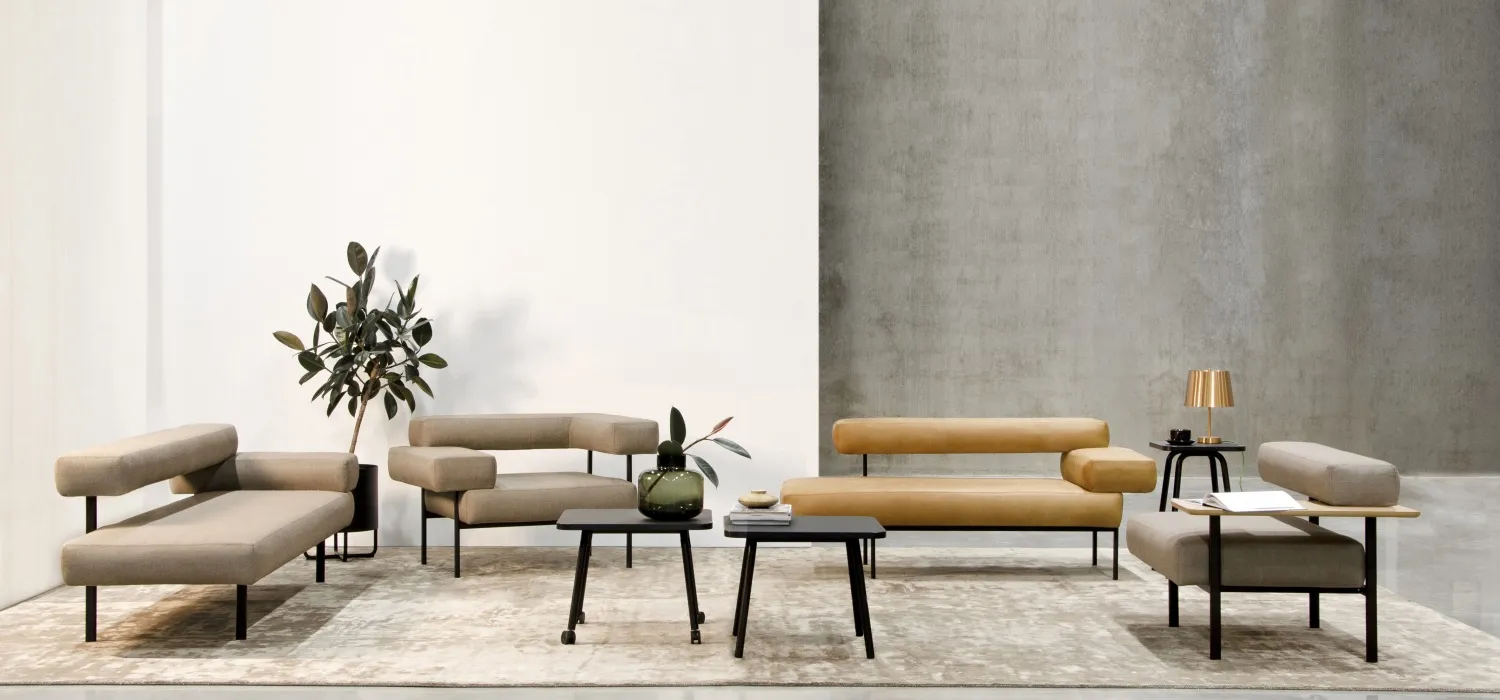 The upholstered elements are held in place by a metal frame, creating an eye-catching combination of varying levels. Plateau is also available without armrests. These can be replaced by a small table that provides a handy surface on which to stand a coffee cup, for example, or perhaps a small computer. Plateau can be used in a variety of settings, such as waiting rooms and receptions, as a seat for several people in an exhibition hall, or at home in the lounge.