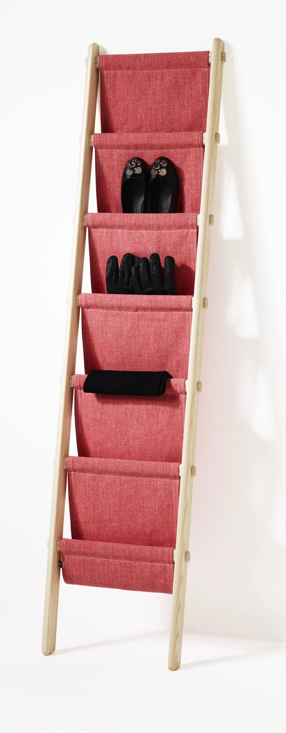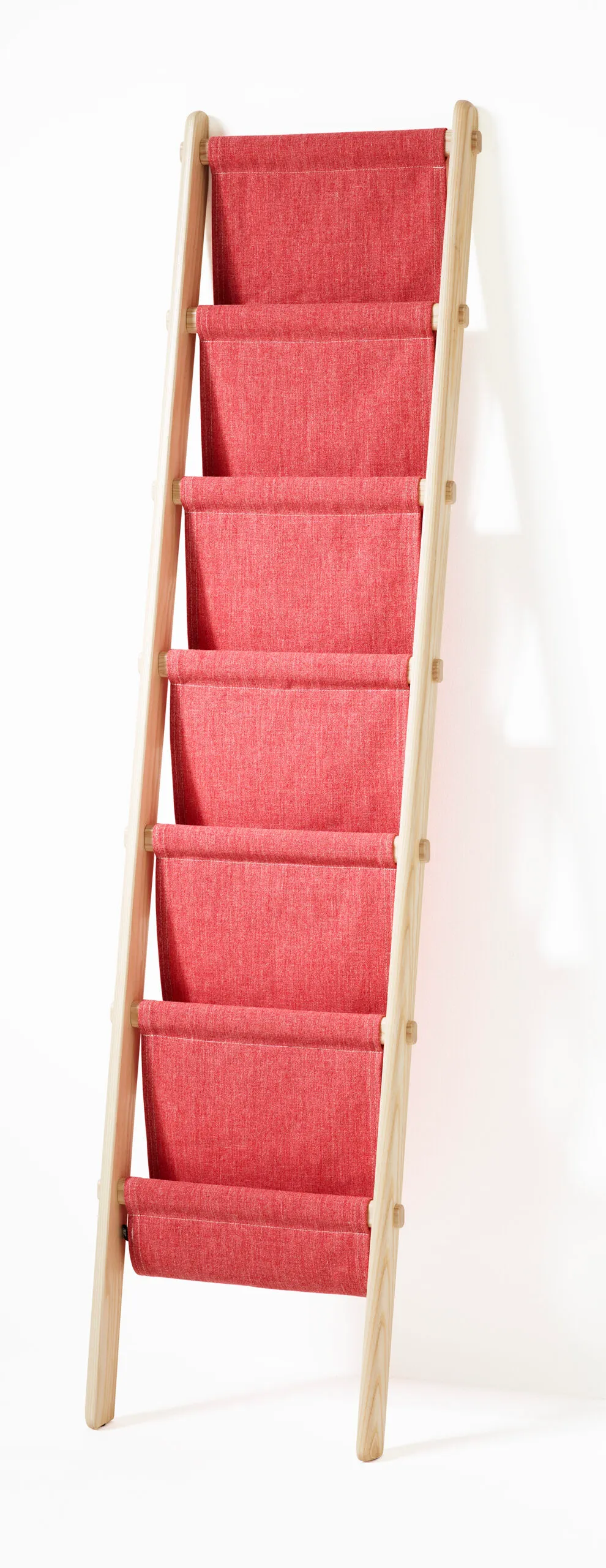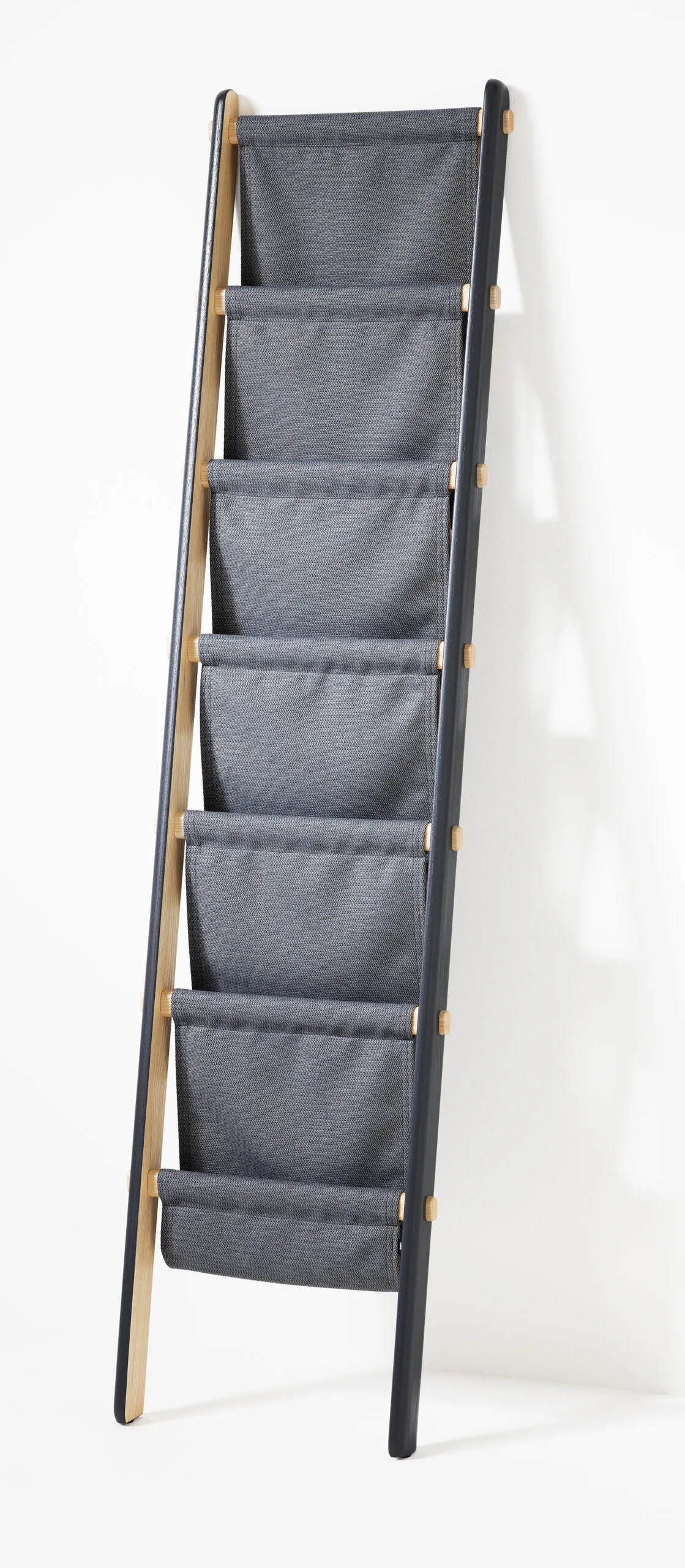 a ladder with draped fabric. It can be used for storing everything