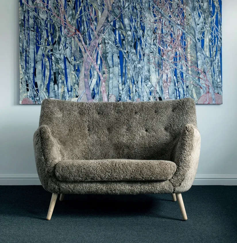 The Poet Sofa is also one of Finn Juhl’s experiments for his own home. At the Guild Exhibition, the sofa was shown together with a couple of plaster reliefs by artist Sigurjón Ólafsson. In this way, he indicated the link between furniture and sculpture. The small sofa is a very comfortable embrace for two people, who will be sitting comfortably close.