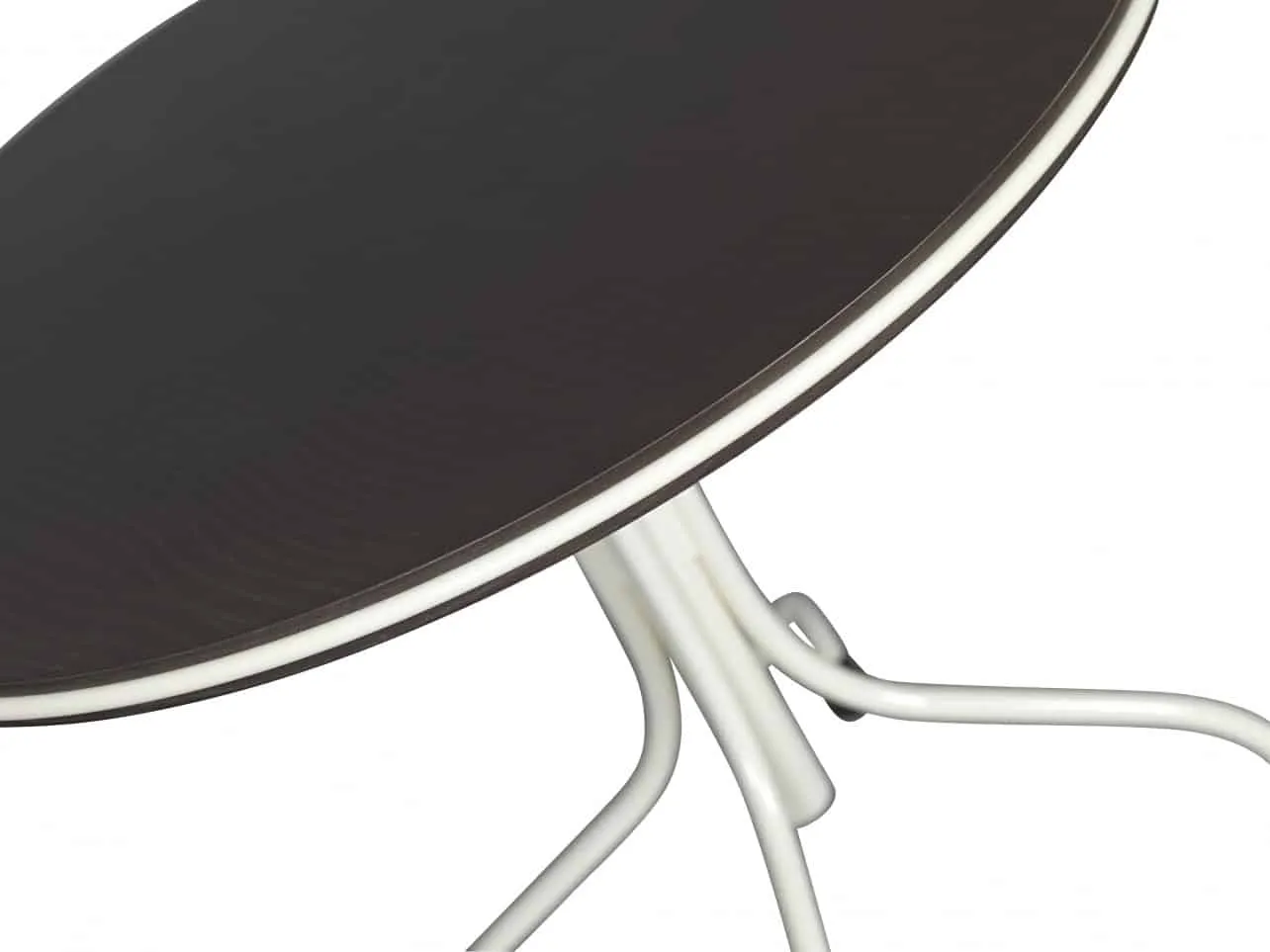 Steel frame. Table top in wood with metal ring. Rubber endings