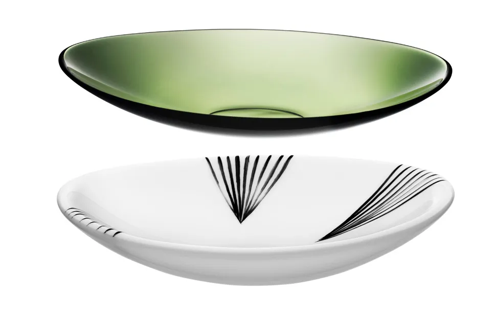 Ingegerd Råman’s ever-popular Pond collection now comes in three new colours – transparent bottle-green, grey and opaque white. The white dishes are decorated with a hand-painted pattern of glimmering platinum, while the green ones feature a sand-blasted straw pattern and come in two different sizes. Pond Grey and Green have taken on the traditional Pond shapes but lack the characteristic sand-blasted pattern. The Pond White series comprises four different dishes, all with the Asia-inspired platinum painting. The original inspiration for Pond came from the little pond outside the Orrefors hot shop, the shapes of the dishes representing the rings spreading on the water. Try mixing the various green, grey, white, black and clear Pond dishes when you’re aiming for a functional yet elegant table-setting.