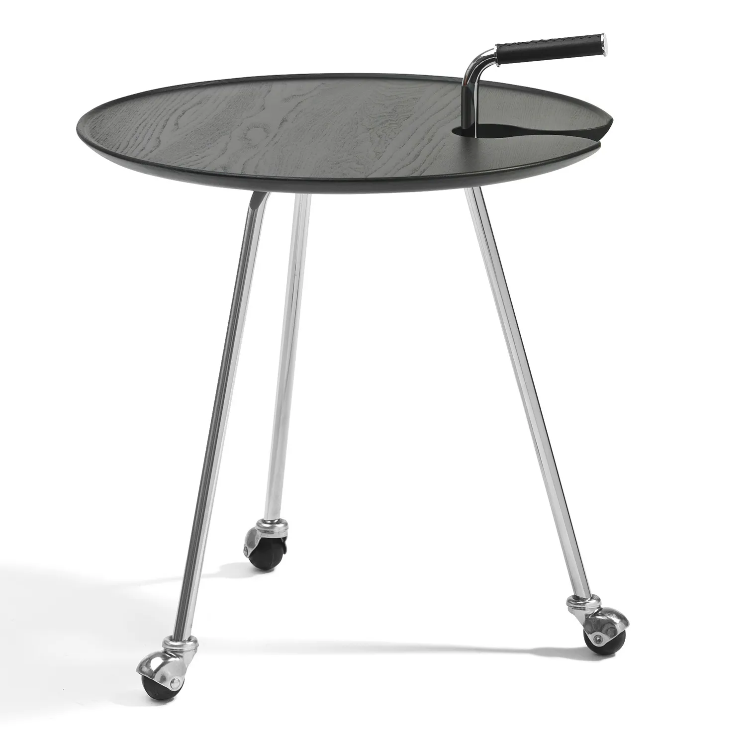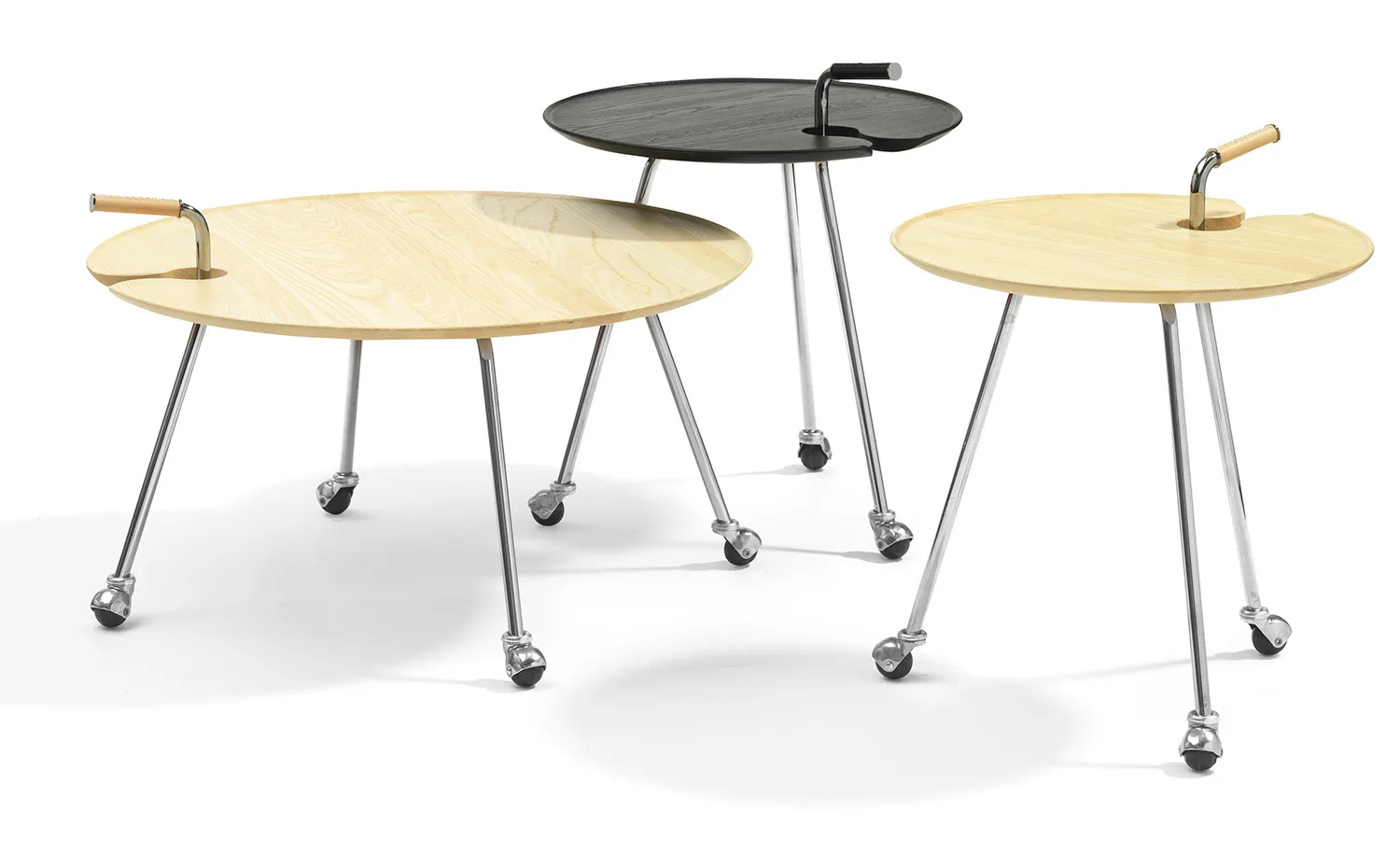 When what is functional is beautiful and decorative too, its appeal becomes almost irresistible. POND is a table that you can easily move around. There are actually two tables in various heights and size, a crossover between coffee table and tea trolley, where the wheels and the handle define the function. The design is uncomplicated; the milled tabletop and the leather-covered handle are the most eye-catching features. The table’s shape has been inspired by a lily-pad, triggering positive associations with one of nature’s most iconic supporting surfaces. There’s a 1950s feel to it, as well.