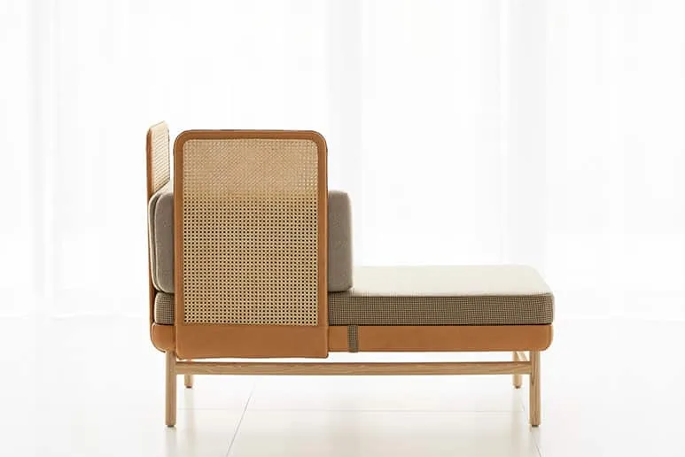 Conceptually our inspiration was early 70s silk scarfs by Hermès and the timeless rattan handbags by saddle maker Palmgrens. The high backrests create a partition effect and are made of rattan finished with a strong leather edge. Something else that’s new is the upholstery that is completely removable for both the seat and back, and the sideboards are covered with matching leather. The textiles have been carefully selected: herringbone and houndstooth wool fabrics harmonise the entire composition. It is a POP sofa exuding exclusivity and quality, providing good conditions for durability and a beautiful patina.