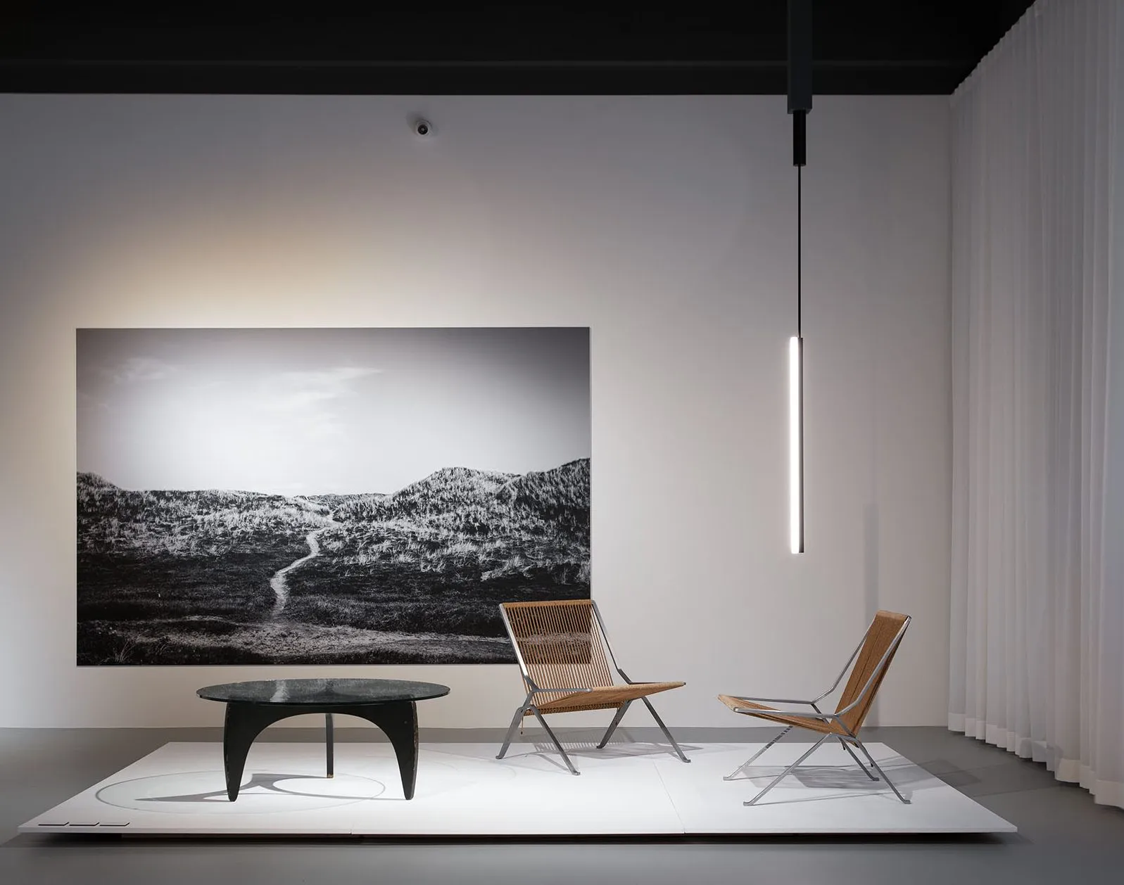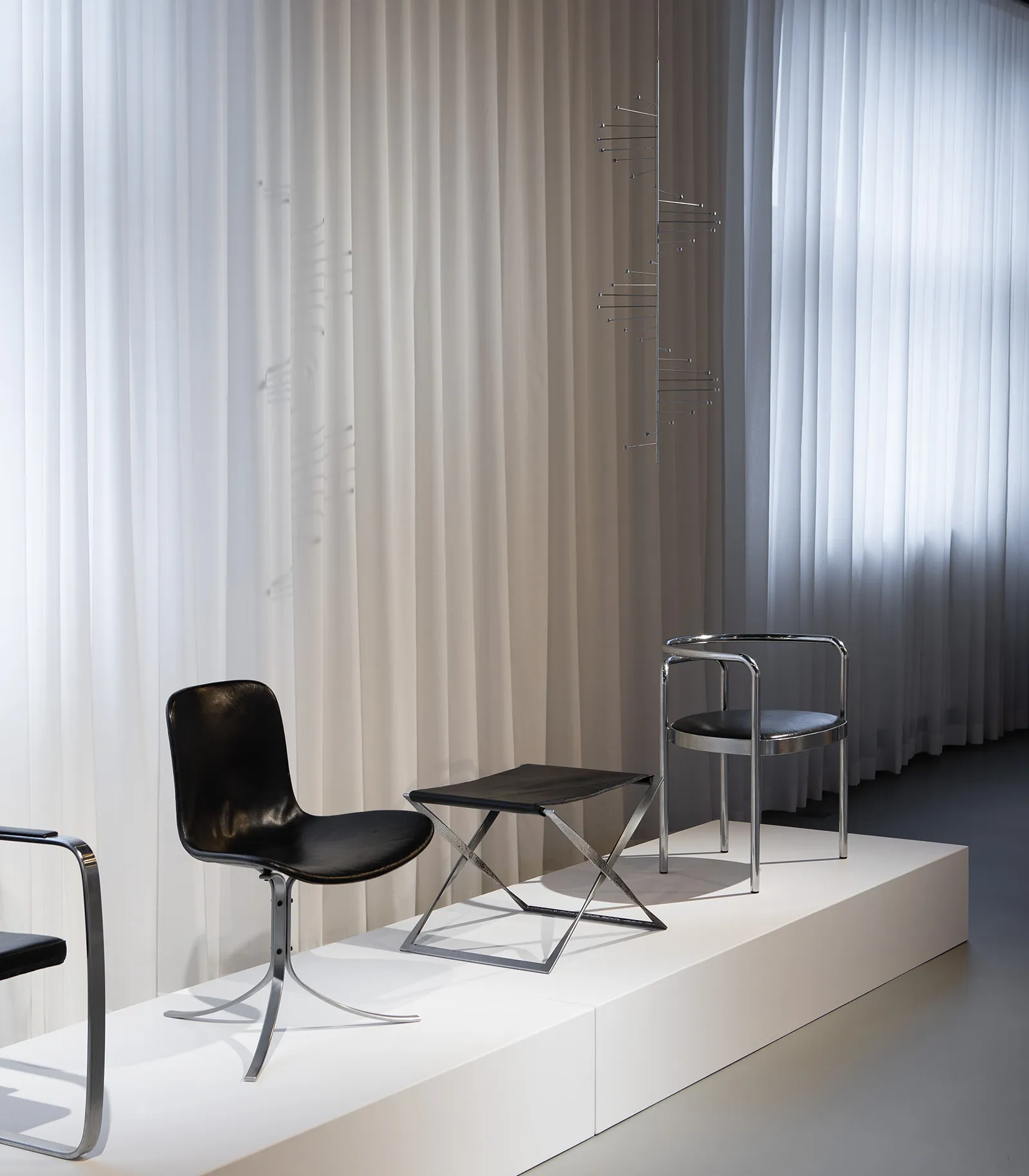 To complement Kjærholm’s light and minimalist idiom, the furniture is presented in dialogue with renowned Cypriot designer Michael Anastassiades’ lighting design. Anastassiades’ consistent materiality and aesthetics embody a poetic simplicity that exudes vitality. In combination with Anastassiades’ lamps, Kjærholm’s unique sense of space and uncompromising focus on entirety is highlighted.