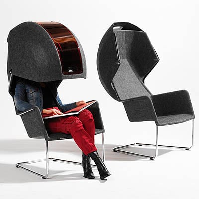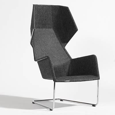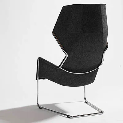 In a time when we are pulling down existing barriers to promote encounters and a sense of community, a new need for separation is soon created. A modern wing chair in moulded felt, with the material in the seat rim pressed to its limit and a stand of chrome-plated steel. Possibility of adding a cover/visor in moulded felt with a Plexiglass front.