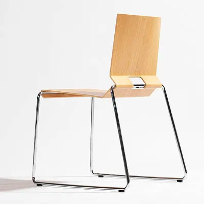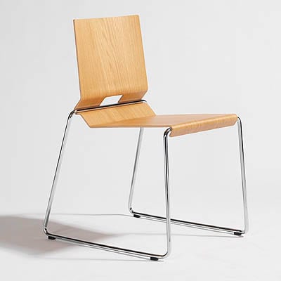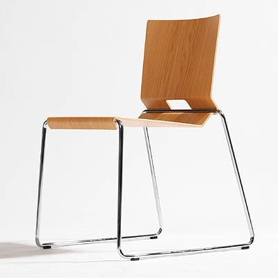 Chair with moulded seat rim and legs in chrome-plated steel. Comfortable, light, stackable and linkable. The seat rim’s surface is available in birch, walnut, oak or painted white, black or red.