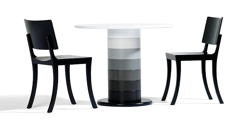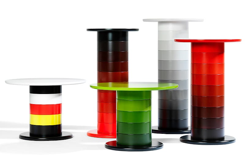 is the result of a thought that became a very easily understood table system. In the world of furniture, the chair has always played the central role as the individual, and the table has been seen as it’s servant. In Babel Fredrik Mattson has found a shape that allows the table a soul and the possibility to play an important role in an interior. Compression moulded rings in birch stacked on top of each other (were every ring builds 95mm) gives a big variable in height possibilities. The colour spectra from black to white, from black to red, from black to green or the other way around gives tension in it’s expression.