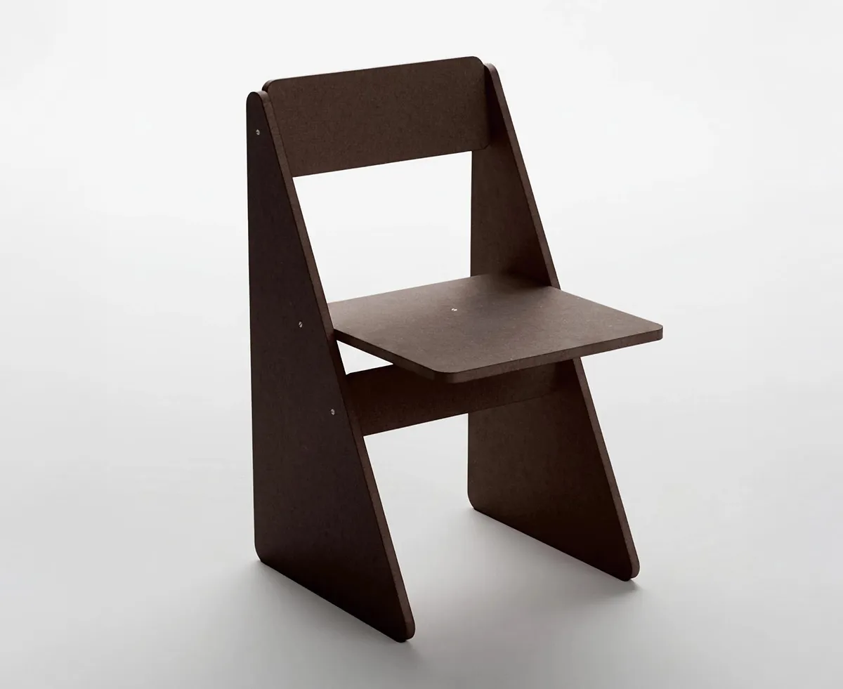 The chair is constructed from Valchromat, a contemporary sheet material produced in Portugal from recycled wood waste including chips and branches collected from forest floors. Wood fibers are dyed with organic colors and bonded with non-toxic resin that meets safety standards for children’s toys.