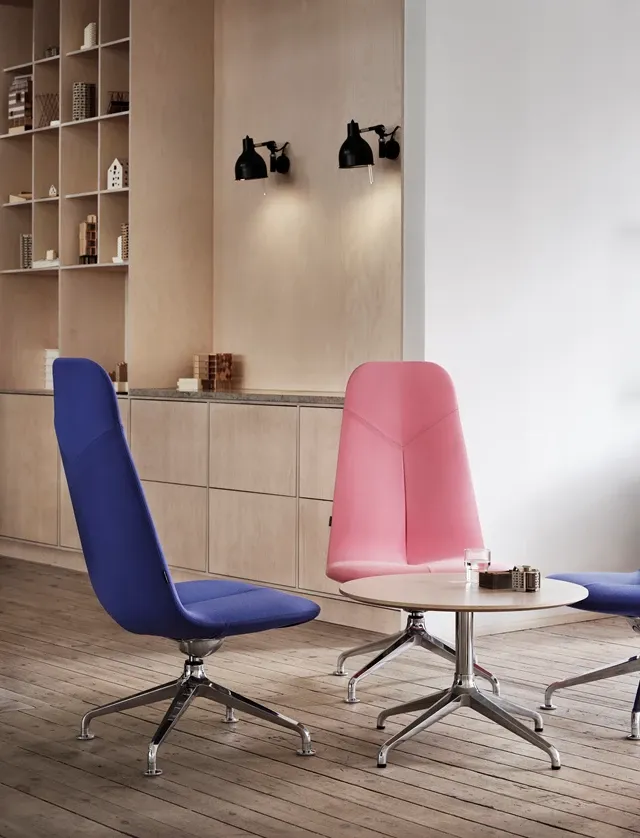 “An easy chair in the Primo range seemed an obvious addition. It incorporates the range’s soft, rounded, body-friendly shapes, contrasted with distinct stitching, lines and angles. Solid materials, the specially-moulded cruciform foot in recycled aluminium and a high degree of comfort when seated makes it a classical but contemporary chair that will last. A chair for working, chatting and relaxing in.”
