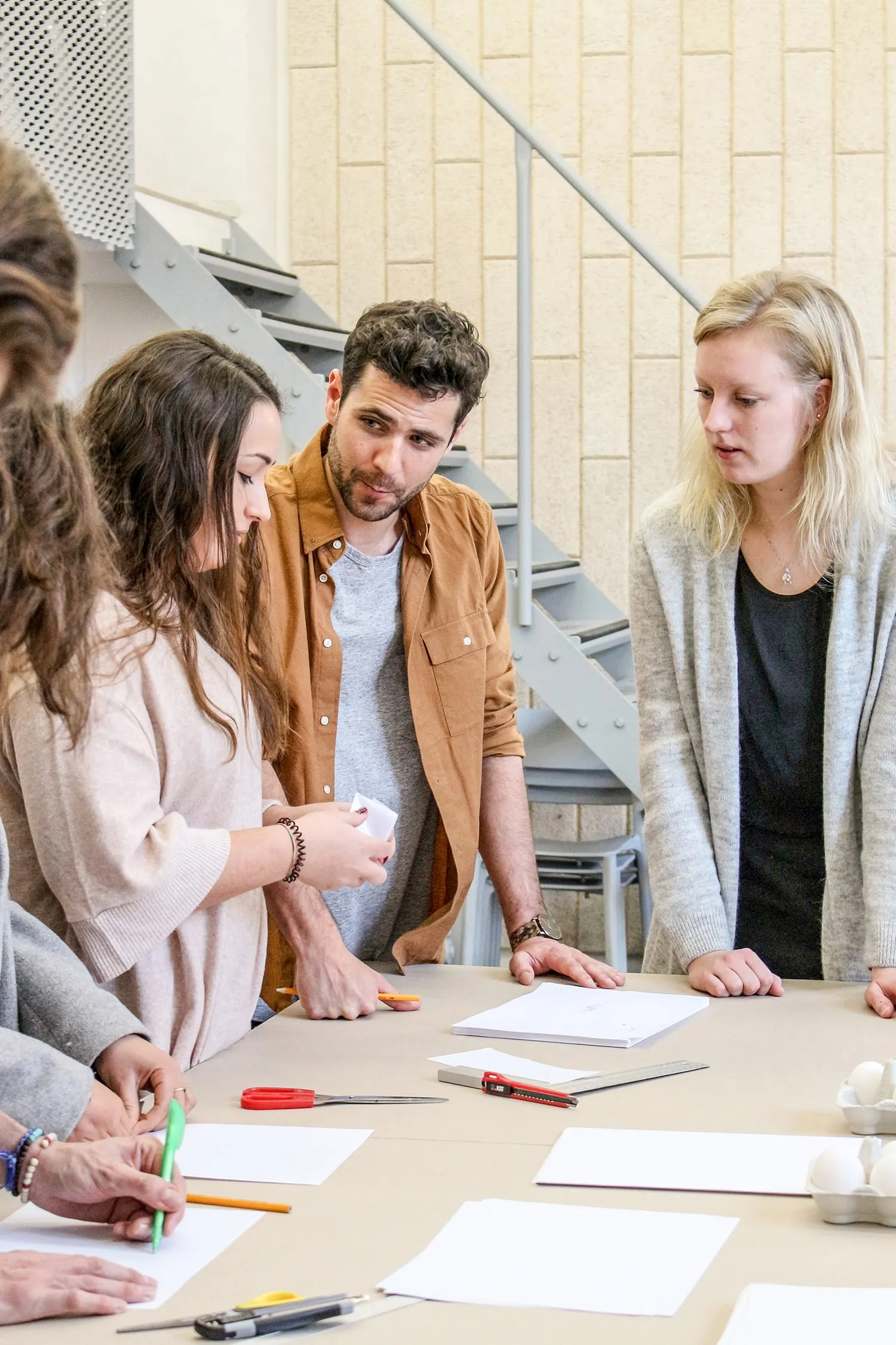 The mini-series then culminated in a final assessment, a prototype workshop including a push pin, eggs, paper, and scissors. In ten multidisciplinary teams of three, seventeen different nationalities collaborated to create an impressive array of paper engineering—woven belts, interlocked containers and perpendicular wrapping techniques.