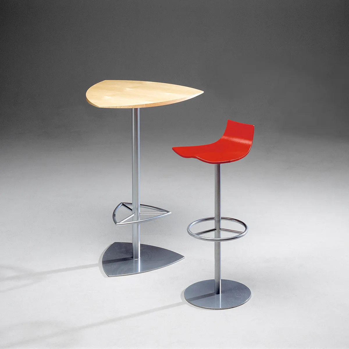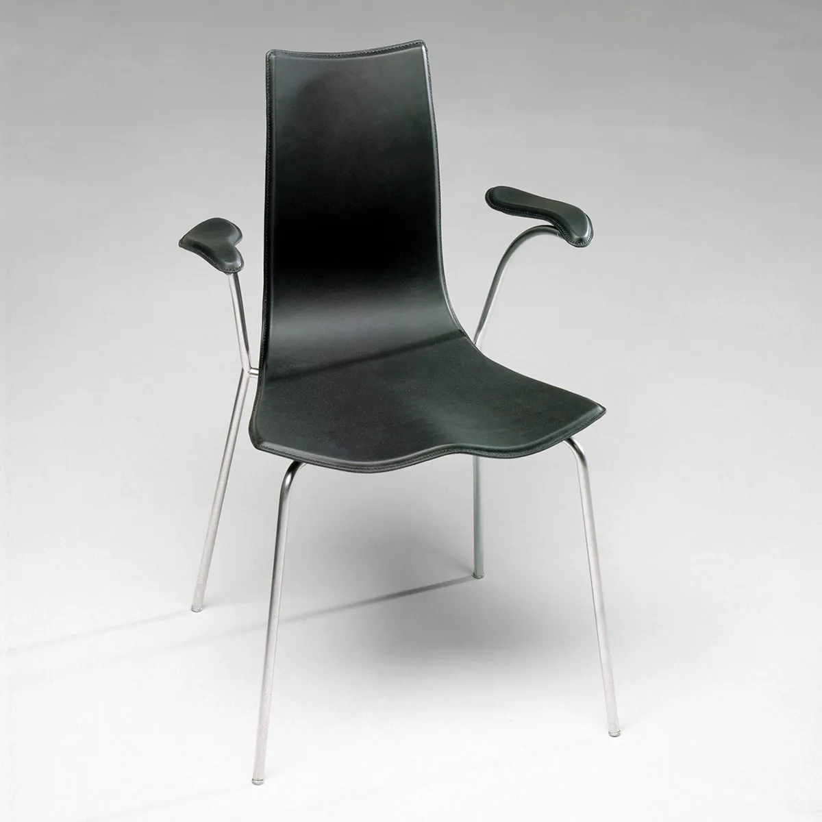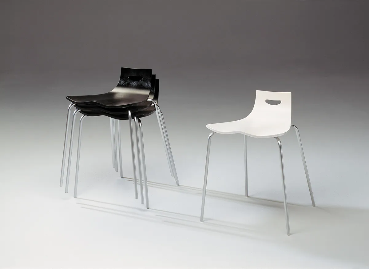 Moulded plywood shells of birch veneer with variable thickness with the characteristic “waving” 3-d shape. The range of steel frames.