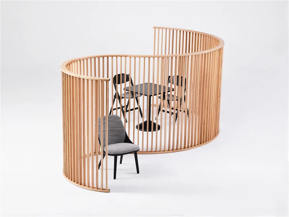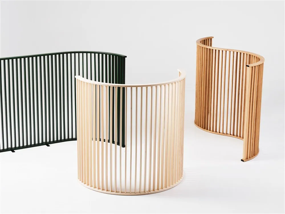Ray room divider is one of the results of a project to transform an office with fixed workspaces into one that offers greater flexibility in terms of the work environment. In order to satisfy ambitions to make full use of natural light in the premises, areas were separated by a trellis construction rather than solid screens. The wooden staves in the trellis create patterns of light, subtle contrasts and smooth transitions, while also fulfilling their primary function of dividing and partitioning the space in the room.