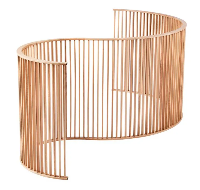 The name – Ray –  is inspired by the way the trellis construction filters the light and creates rays of differing intensity between the staves. Thanks to its curved structure Ray room divider stands steady and stable without any need to secure it to floor or ceiling. This makes it easy to extend in the same way as modular furniture. The curved form also means there is no front or back to Ray, ensuring that it always looks equally attractive from every point in the room.