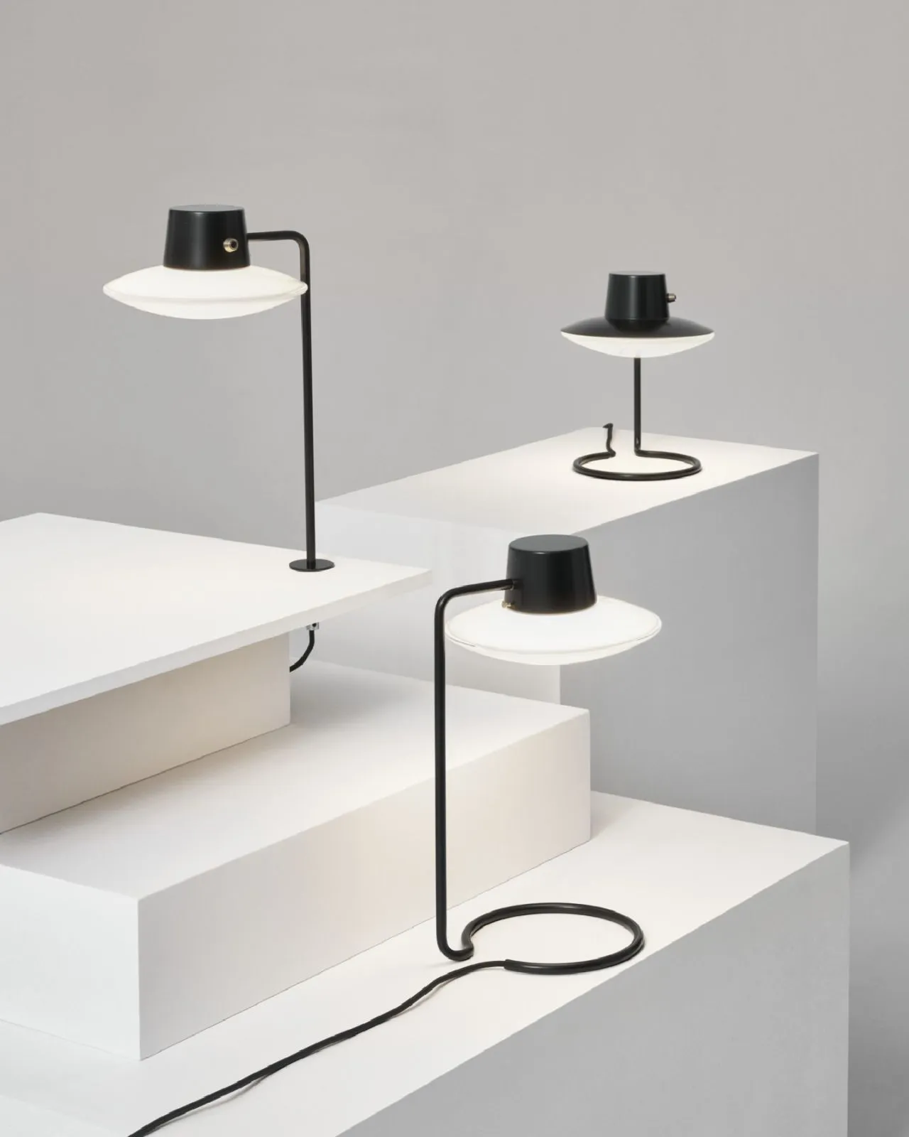 Reintroduced pendant lamps by Danish architect Vilhelm Lauritzen featuring geometric forms and precise proportions