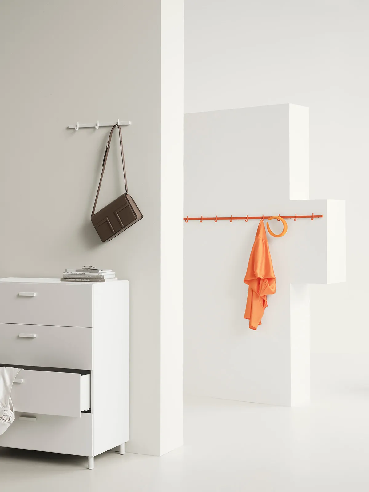 The system itself consists of chest of drawers and hook rails in different dimensions that can be connected and mixed in size and colour.
