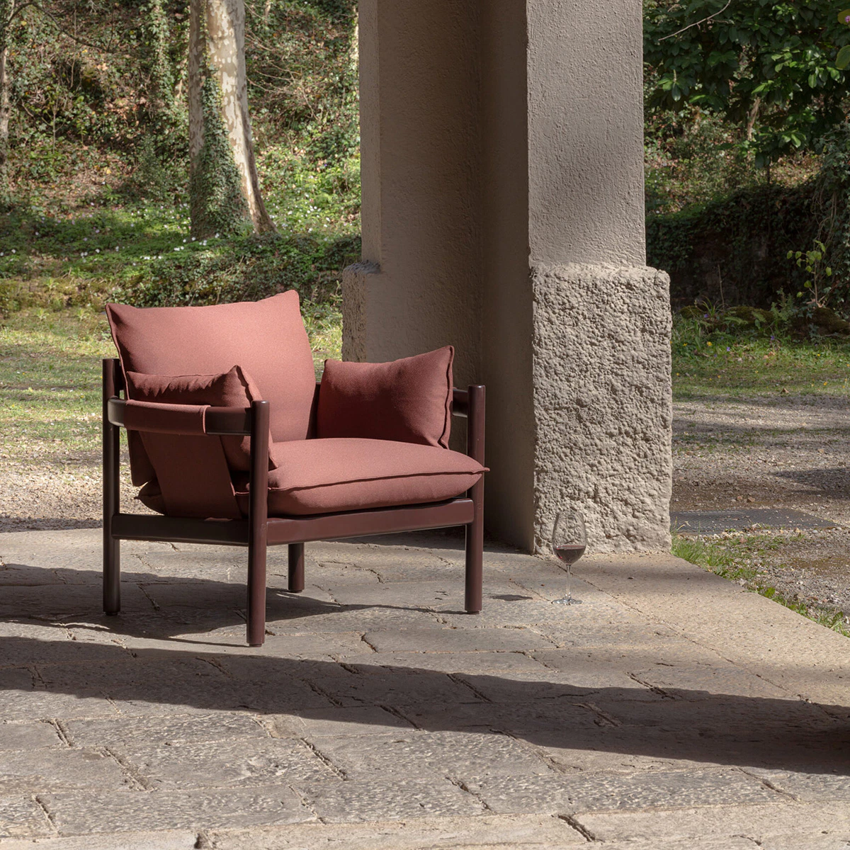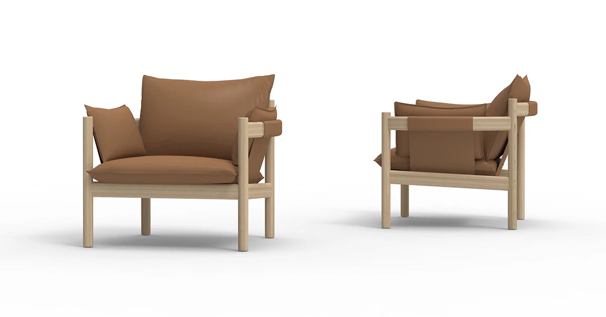 Rento is a collection of very comfortable, warm and friendly armchairs designed by the Finnish designers Studio Tolvanen. True to their style, Julie and Mika Tolvanen pursue a formal look that combines bentwood profiles with textile slings to bring a fresh perspective to the classic lounge chair. Seen from above, the armrests and backrest of the Rento form an almost perfect circle with comfortable pillows which invite the person to sit and relax comfortably