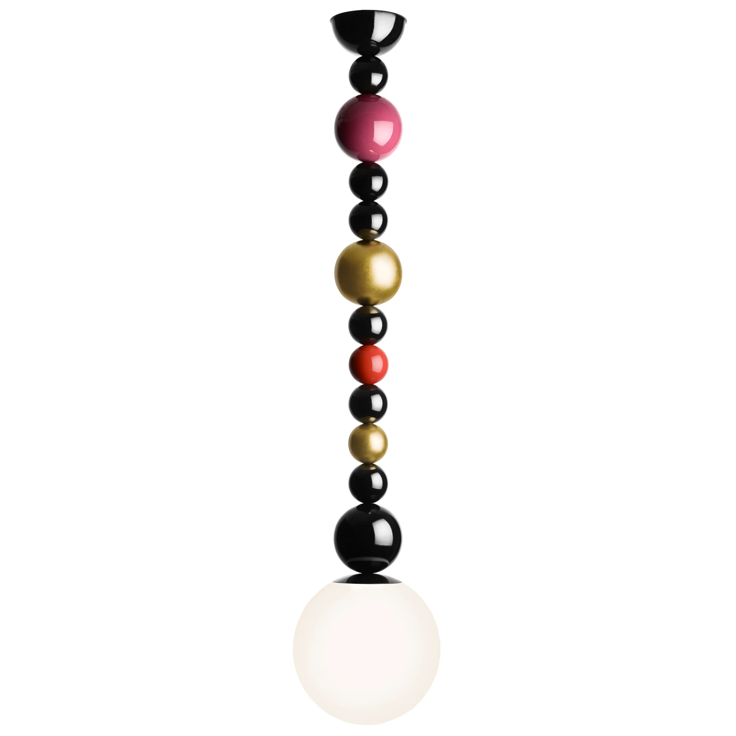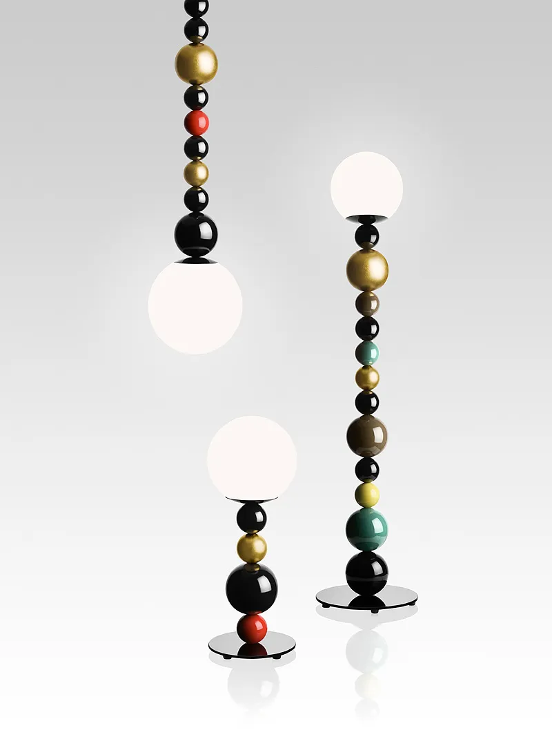The new line RGB adorns the rooms with multi coloured and gold plated balls, stacked on one another and thread on a line like enlarged pearl ornaments.