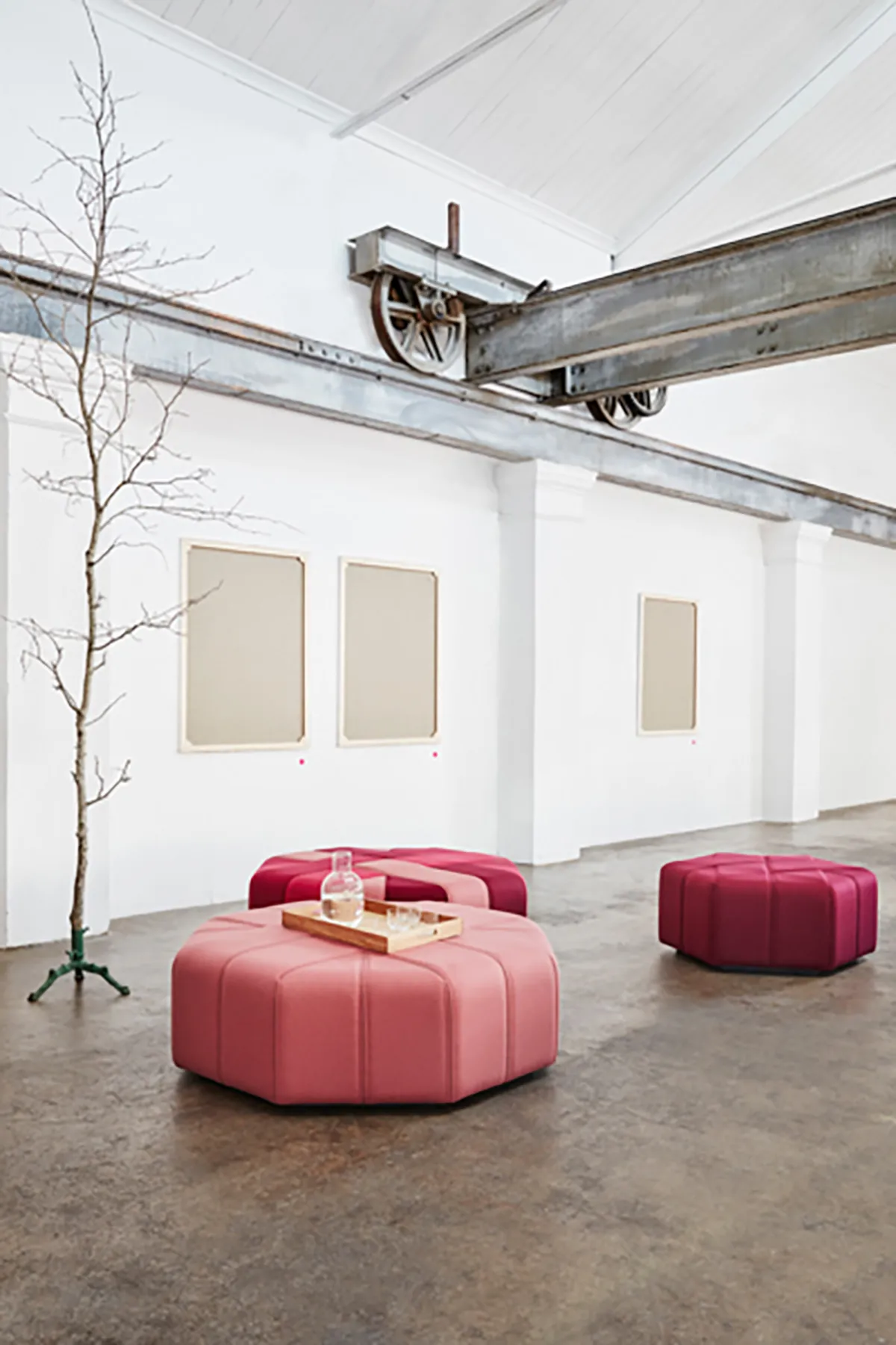 The pouffes have fixed, braided upholstery with the textile laminated onto a stronger material to give a three-dimensional feel.