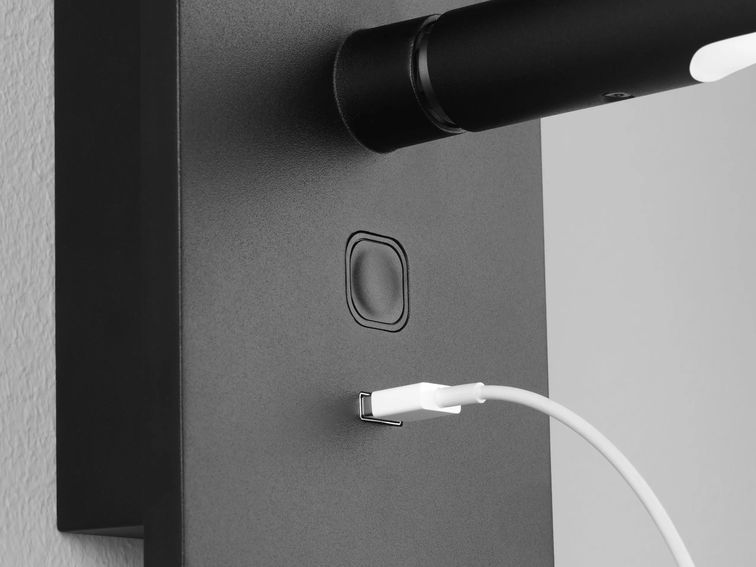 Housing is made in die-cast aluminium. Exchangeable shade in cotton, rotatable reading light in LED with opal acrylic glare. This modern flexible luminaire with an USB outlet meets the increased demand for a product that’s quick to install, flexible in terms of function and offers charging options.