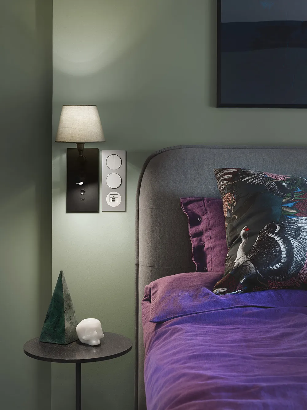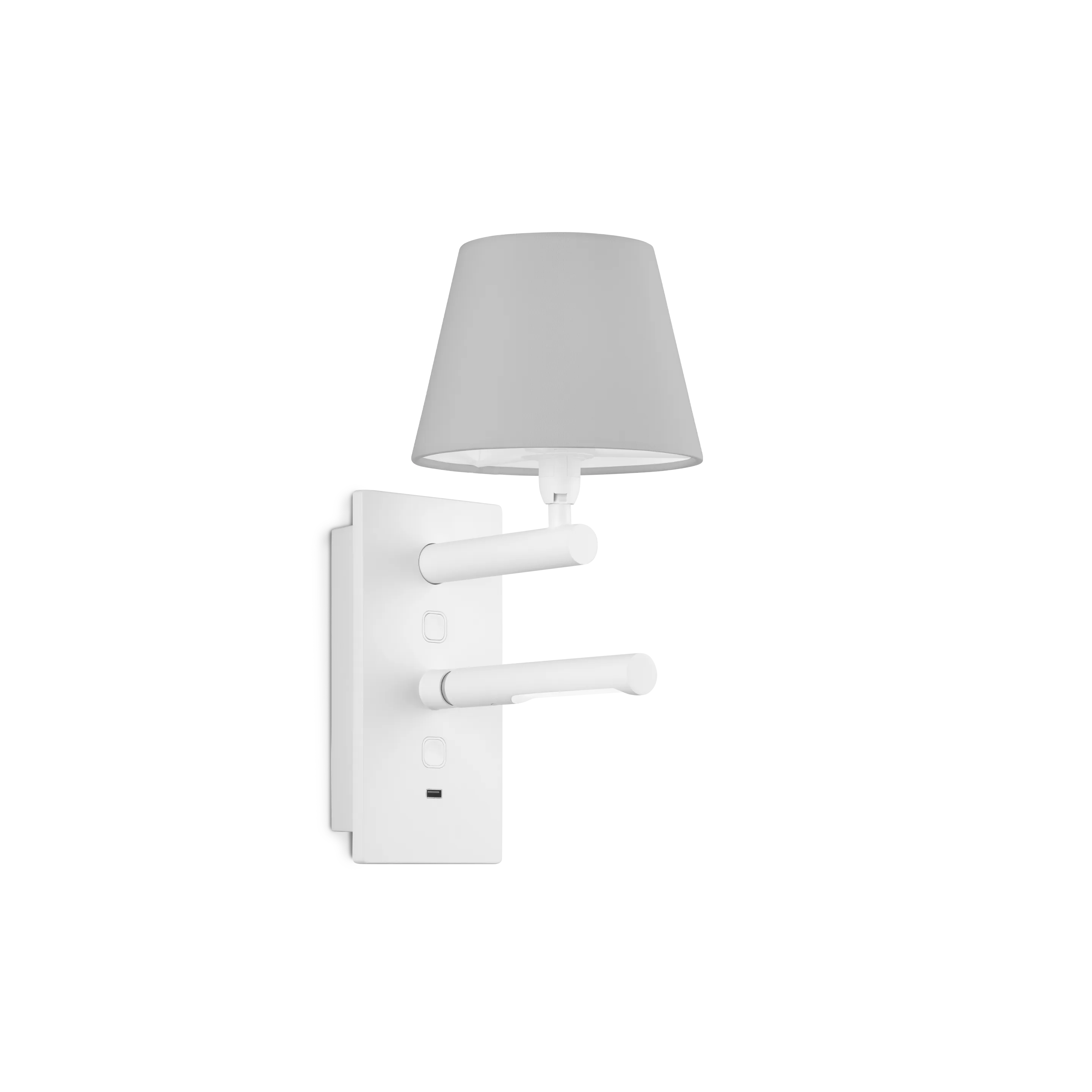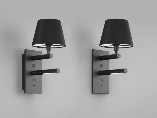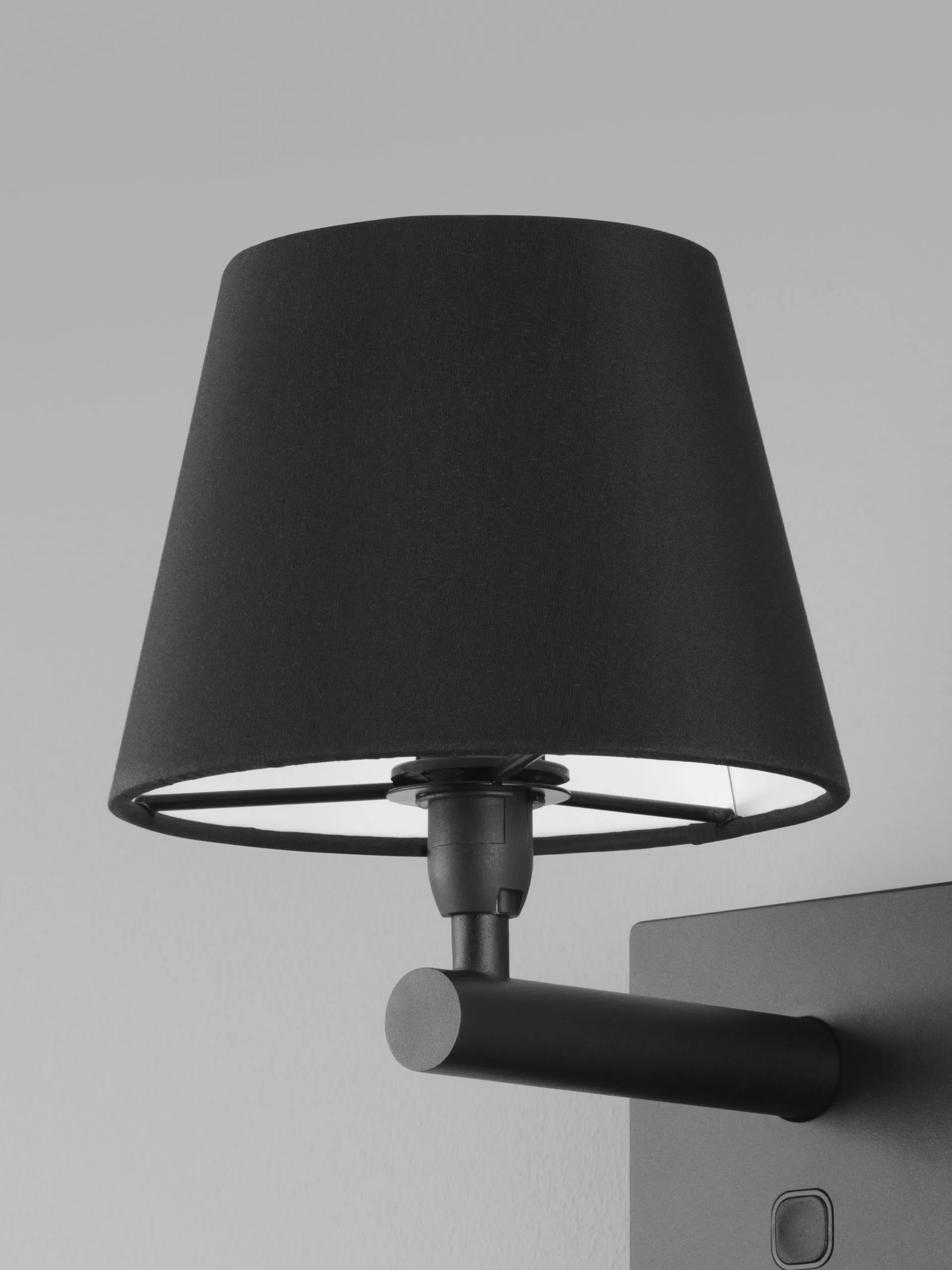 Housing is made in die-cast aluminium. Exchangeable shade in cotton, rotatable reading light in LED with opal acrylic glare. This modern flexible luminaire with an USB outlet meets the increased demand for a product that’s quick to install, flexible in terms of function and offers charging options.