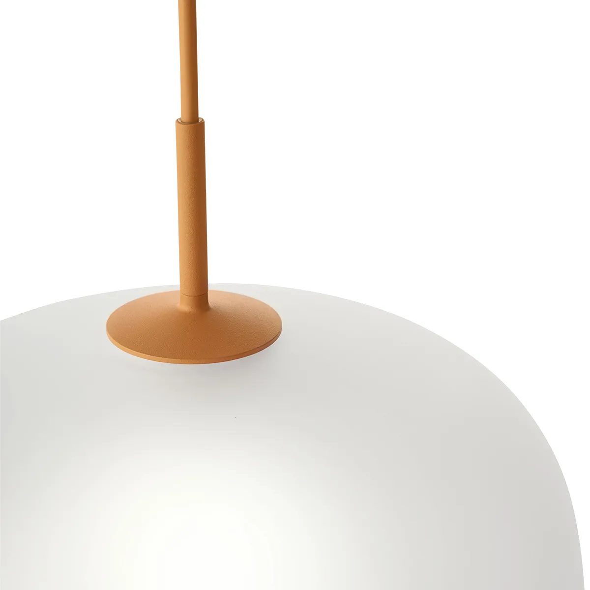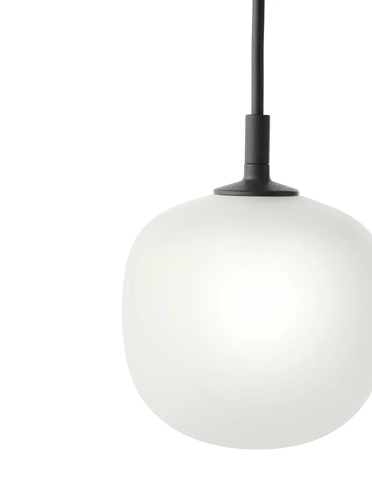 The design has a characterful shape that allows for it to blend into any atmosphere yet with a subtle, modern touch, complemented by its powder-coated top part, pendant tube and cord in matching color. Through the opacity of its glass, the Rime Pendant Lamp shines an ambient, threedimensional light into the room.