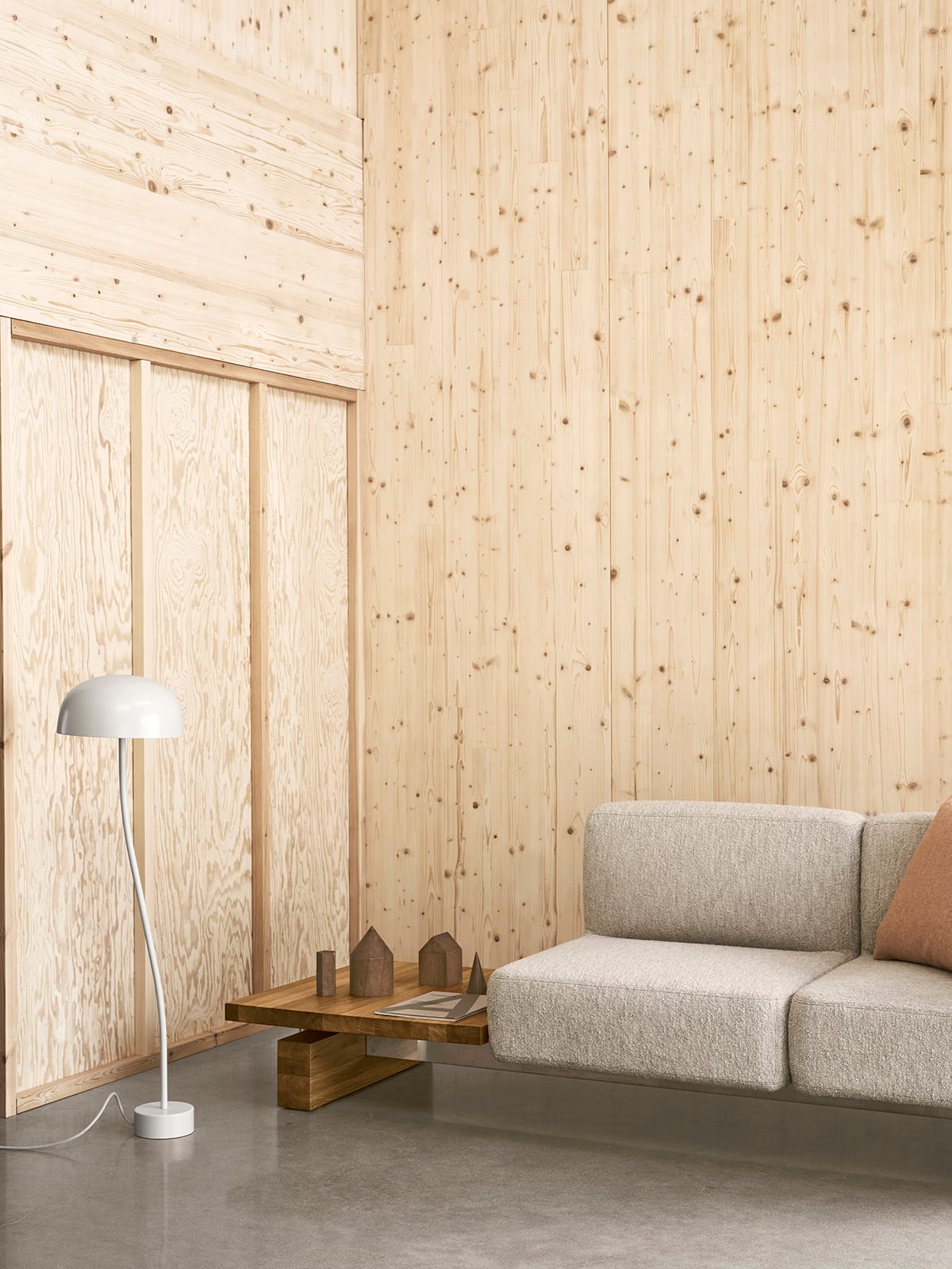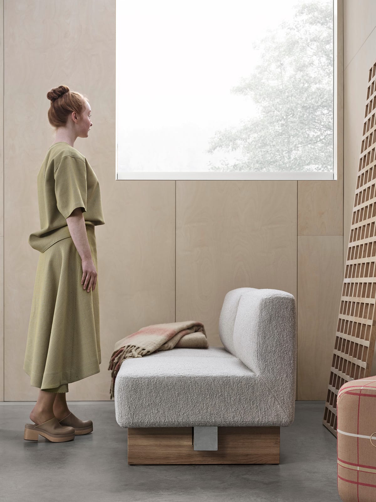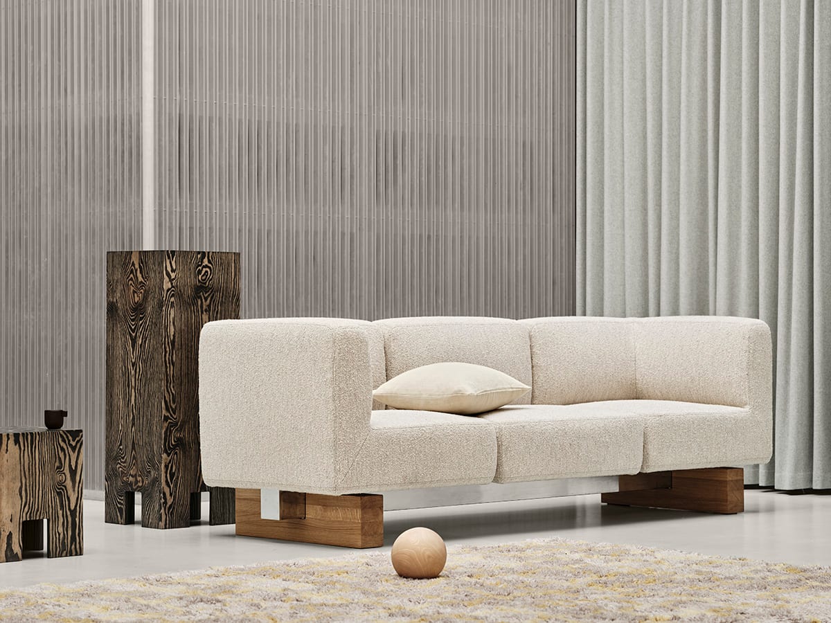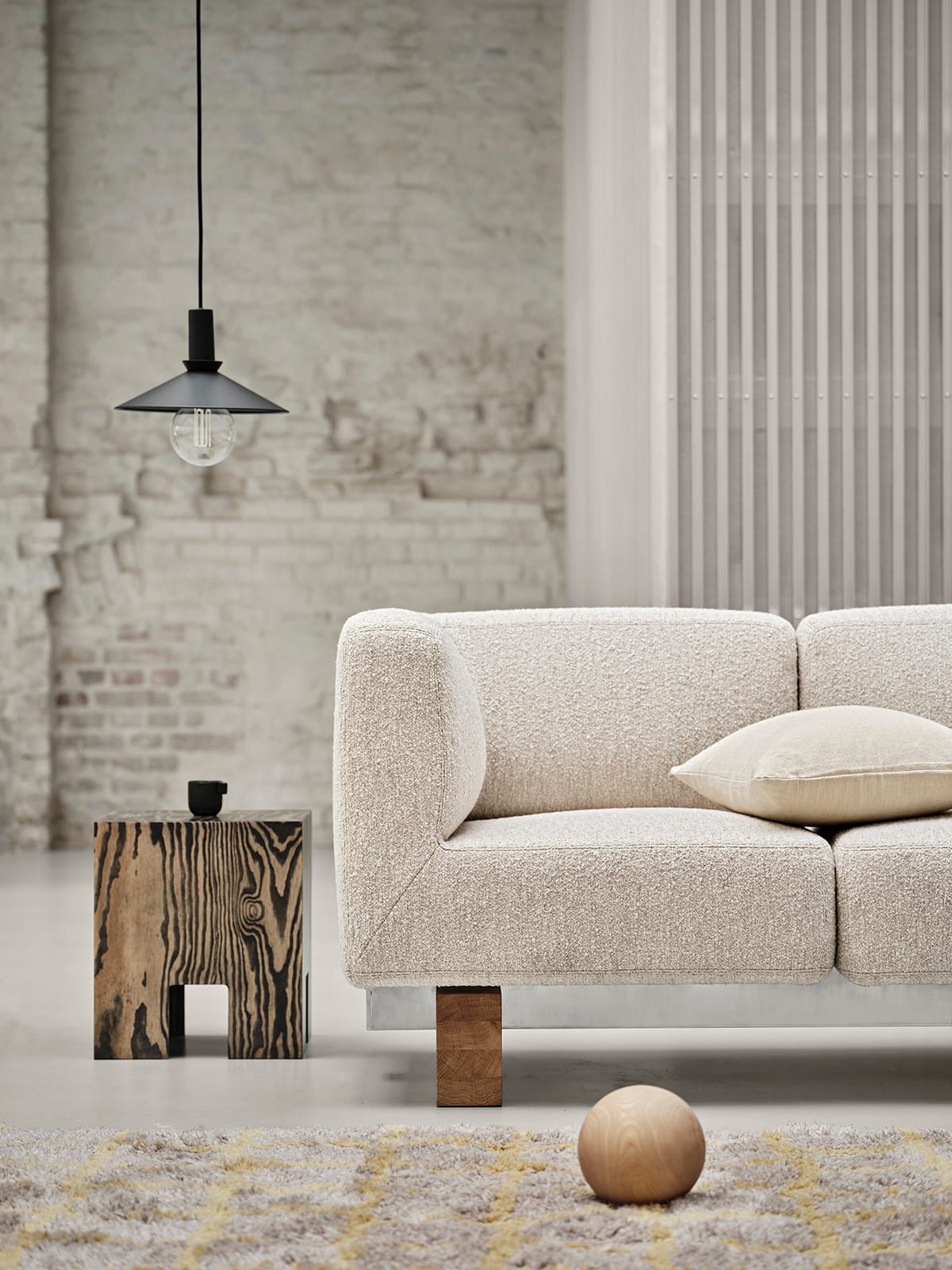 A square sofa system. Each module is 75 x 75 centimeters. Causal and inviting. Or sober and formal. Rut seems like a well-known acquaintance but is a brand new companion. Opt for a laid-back space in one direction: perfect for reading a book, surfing the net, watching a movie, chatting with friends. Bernstrand and Borselius latest modular sofa for Blå Station offer elegant contrast between soft, comfortable and generous seating modules, and a sturdy exposed linear basement made of a steel H-beam resting on two, or more, solid oak supports. Assemble as many squares as needed. Turn them to the right, to the left, or all way around to offer different seating possibilities: affix with two bolts.