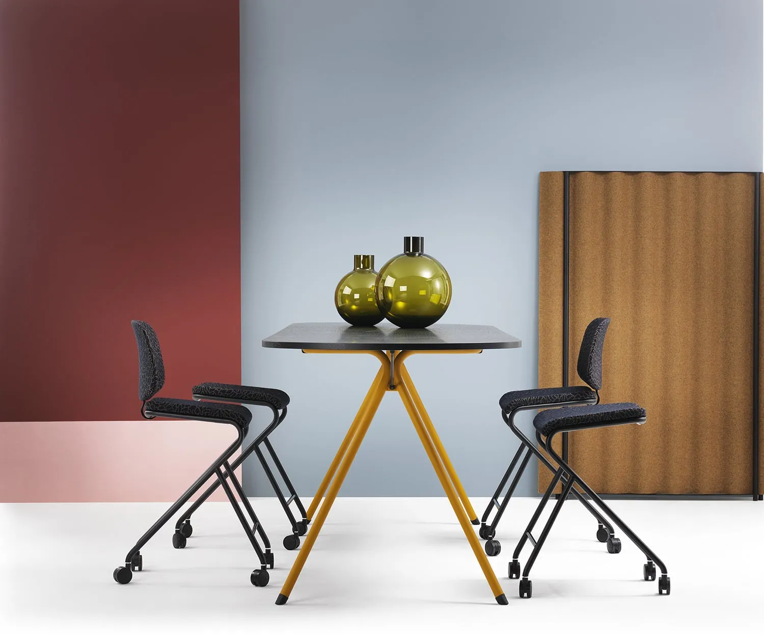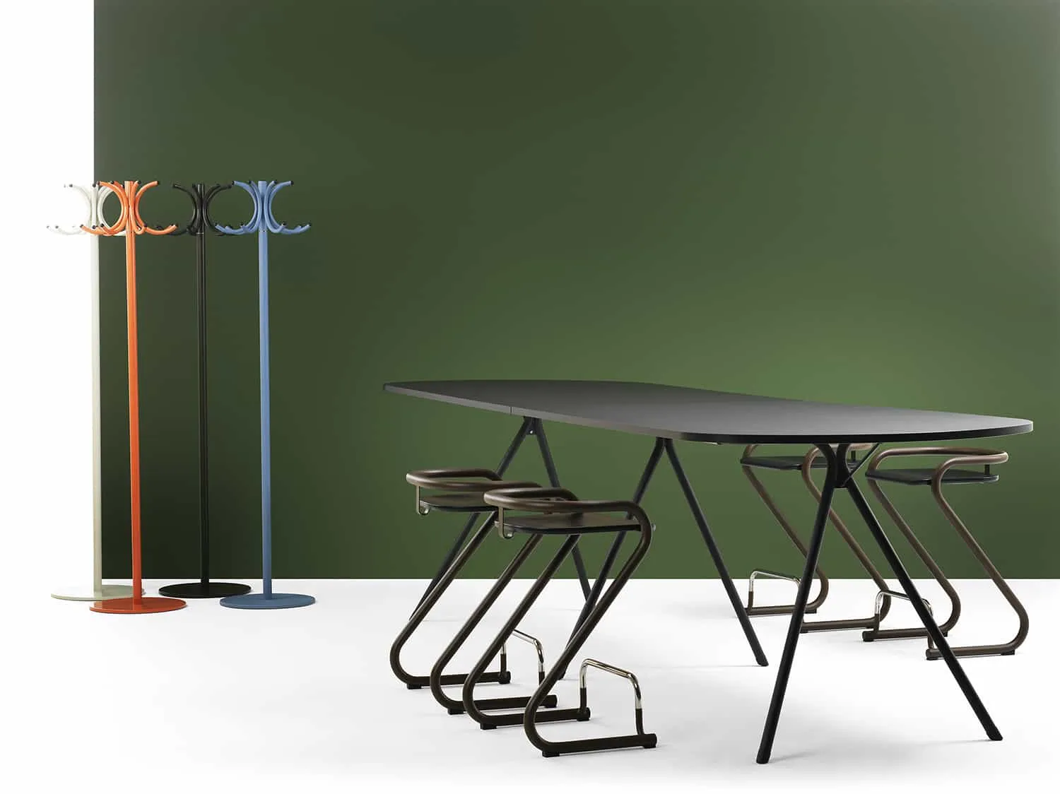 With various shapes and materials for the table tops, different heights and a frame in 30 different colours of powder coating, Anya wanted to enable users to put together the ideal table for their particular needs.