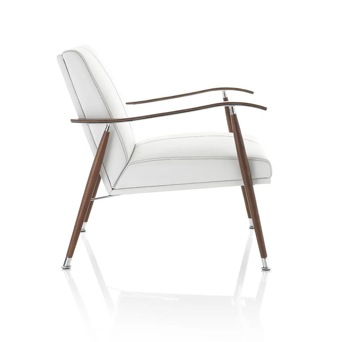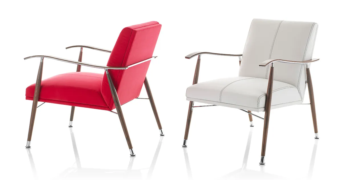 This by a newly designed frame consisting of elegant turned wood legs with chromed details. The characteristic expression that lies in the shape and construction of the arms remains and the combination with the wood legs offers a softer, warmer version of Sahara. The combination between metal and wood creates an exquisite meeting. ”It is like a jewel” says designer Gunilla Allard.