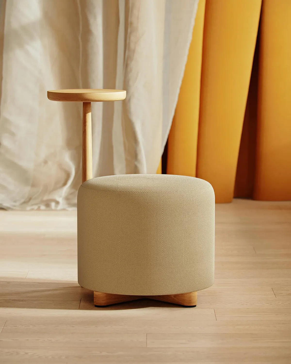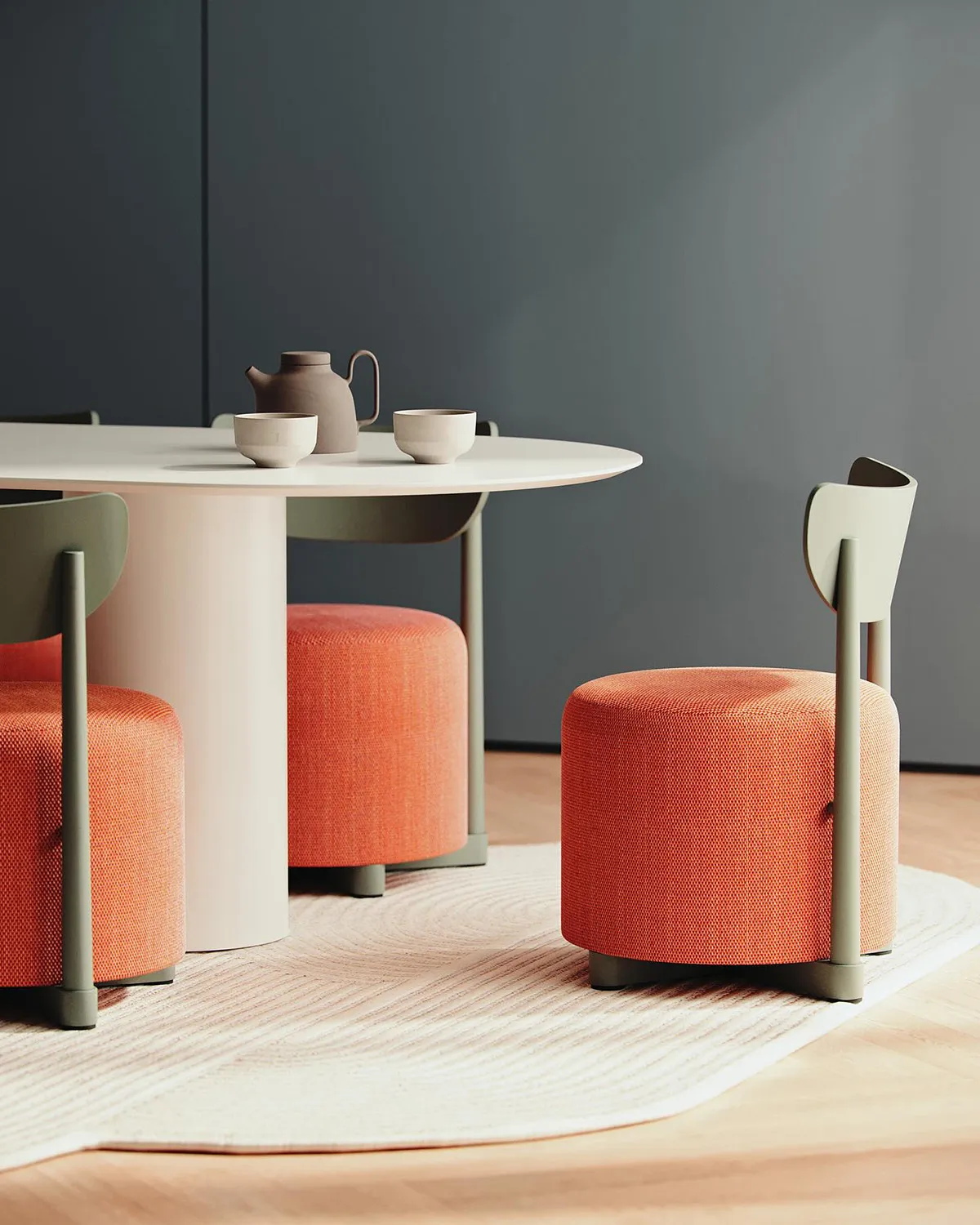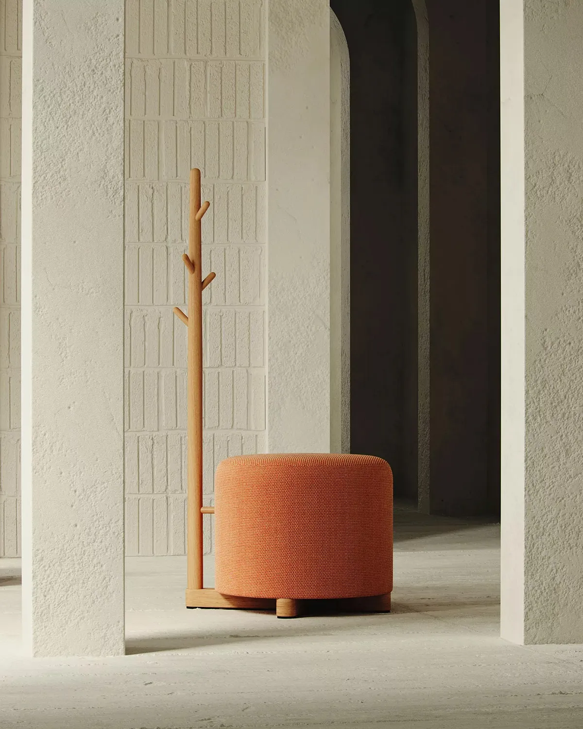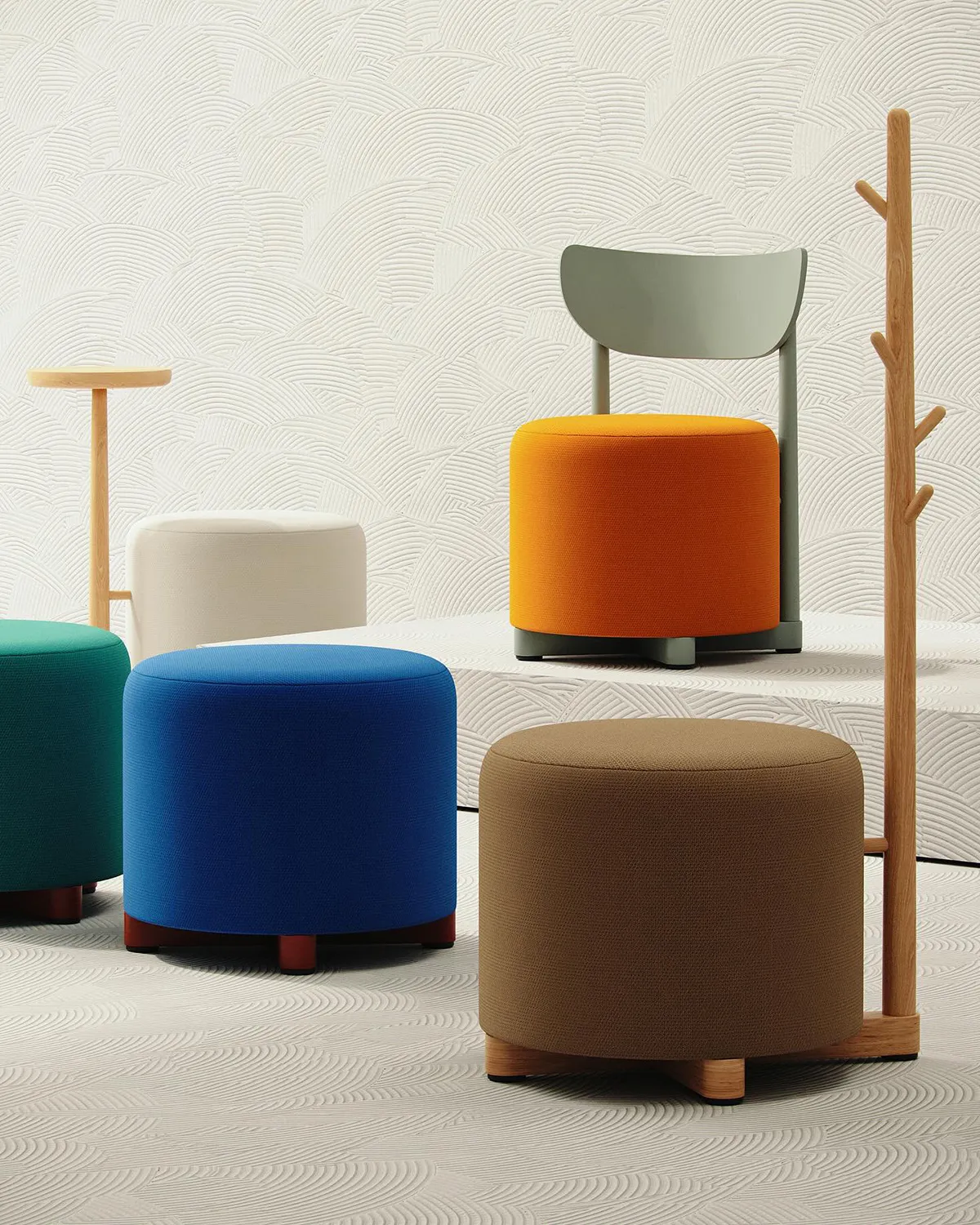 The Family includes several distinct pieces, each enhanced with unique features that define its function. The collection comprises a pouf-chair for comfortable seating, a pouf-table that combines surface and soft seating, a pouf-hanger for practical storage integration, and a classic pouf. Each piece combines minimalistic Scandinavian forms with solid wood details and vibrant color finishes, creating furniture that works across hospitality, office, and residential interiors.