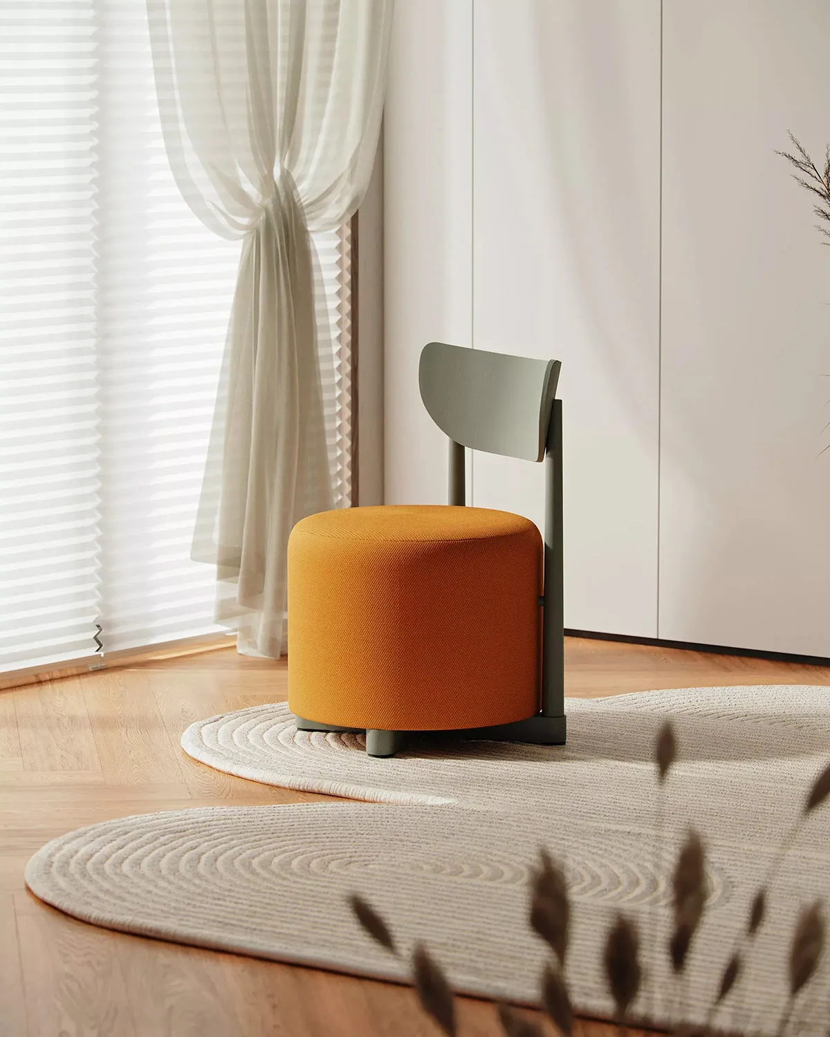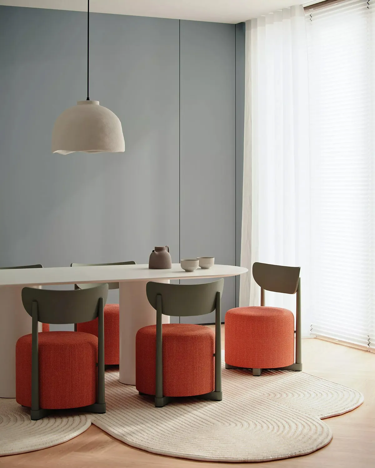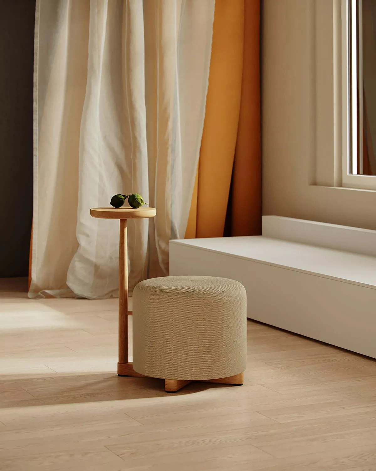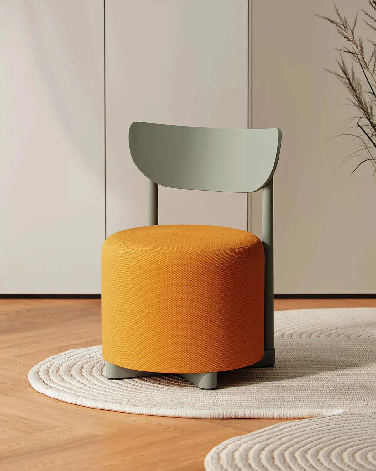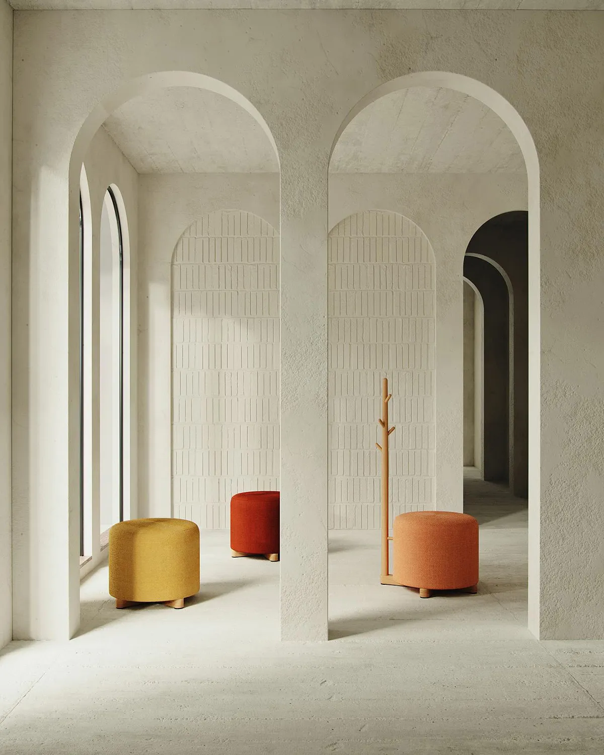 The Family includes several distinct pieces, each enhanced with unique features that define its function. The collection comprises a pouf-chair for comfortable seating, a pouf-table that combines surface and soft seating, a pouf-hanger for practical storage integration, and a classic pouf. Each piece combines minimalistic Scandinavian forms with solid wood details and vibrant color finishes, creating furniture that works across hospitality, office, and residential interiors.