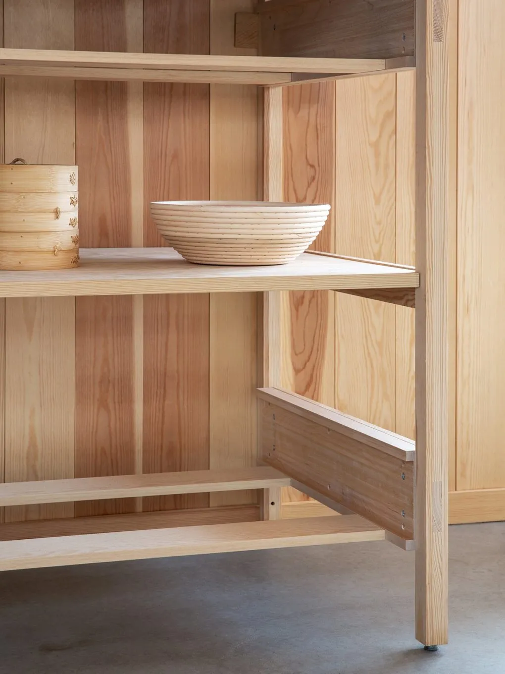 When you craft a kitchen without metal fittings, and with wooden rails in the drawers, the work must be carried out precisely. Here, we also challenged ourselves to use a minimum of materials. The open construction – a matrix of vertical trestles – means that nothing is hidden. We get to show what we have done.