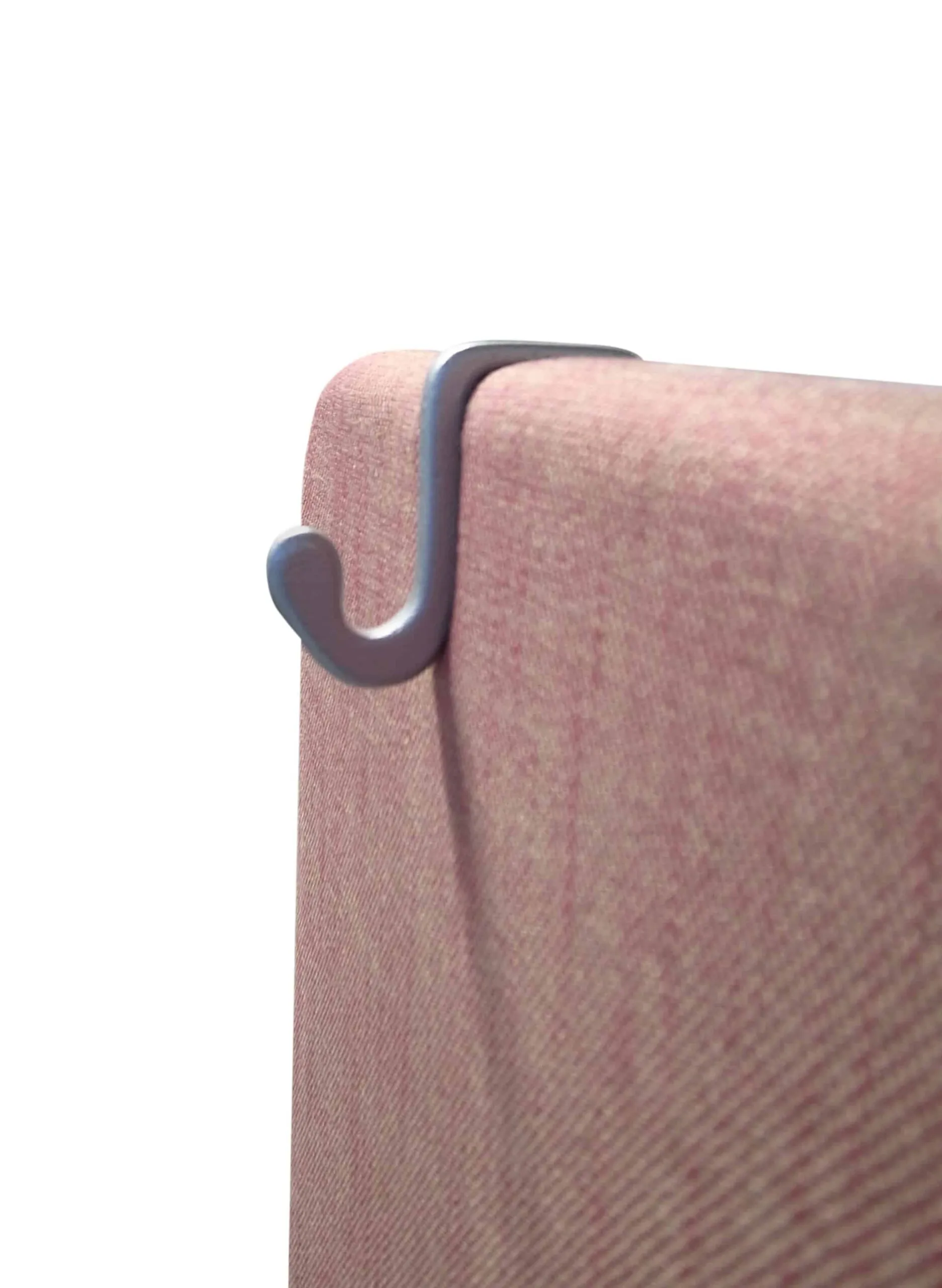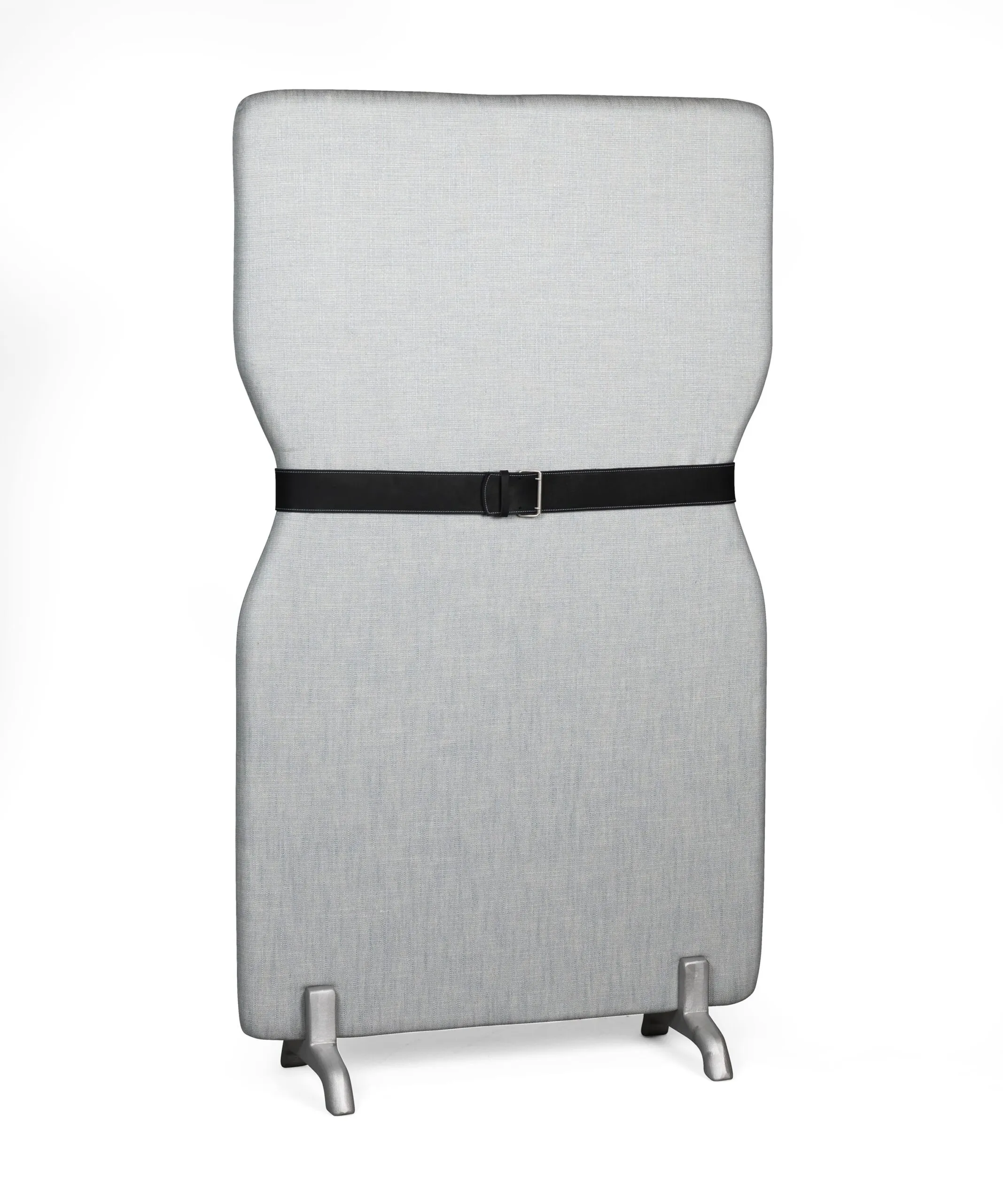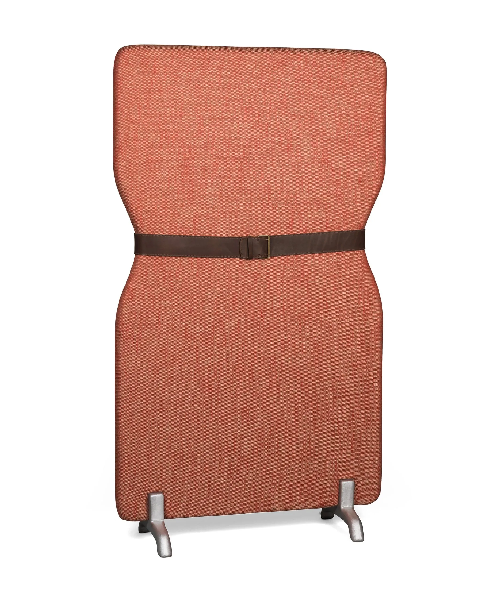 Wooden frame with sound absorbing filling. Leather belt or leather pigtails. Casted aluminiumlegs and hook. h 163, w 93, d 6 cm. Design by Anna Kraitz.