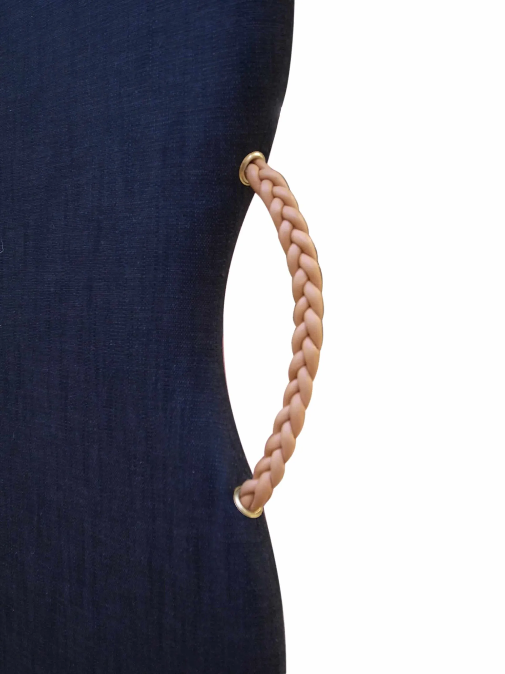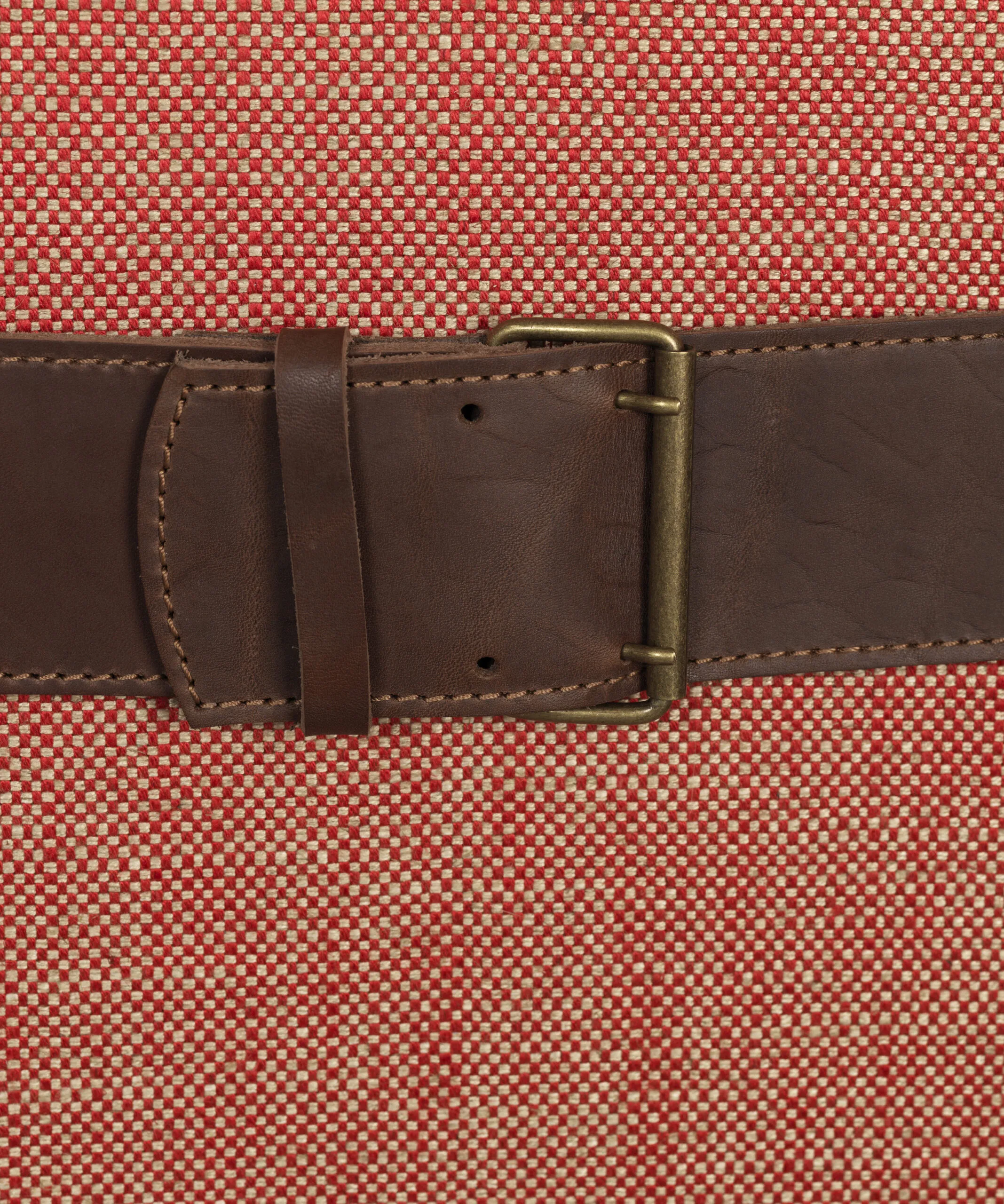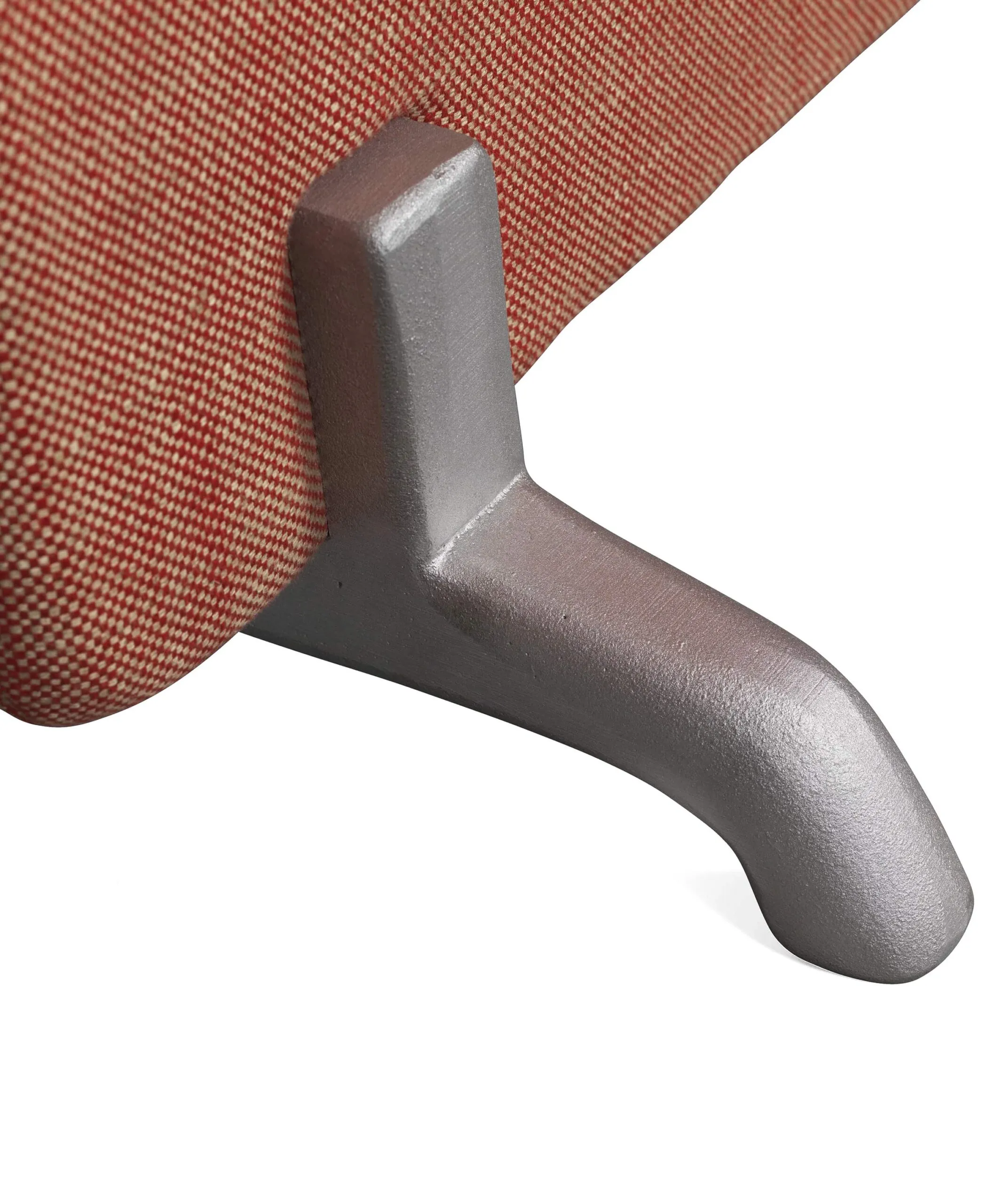 Wooden frame with sound absorbing filling. Leather belt or leather pigtails. Casted aluminiumlegs and hook. h 163, w 93, d 6 cm. Design by Anna Kraitz.
