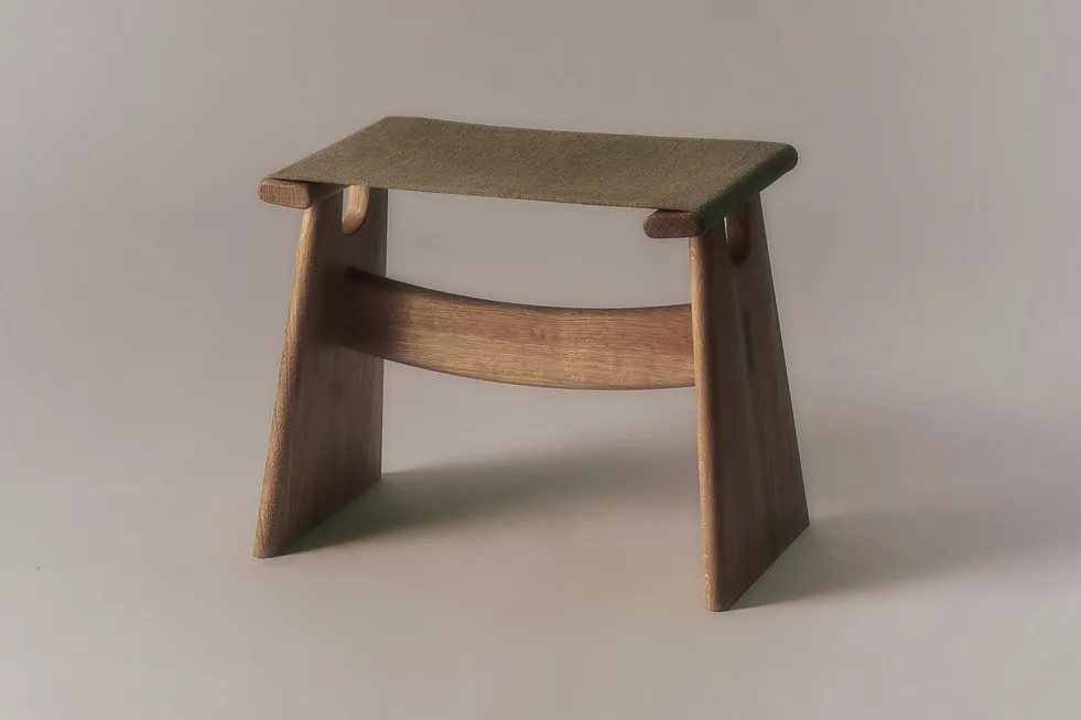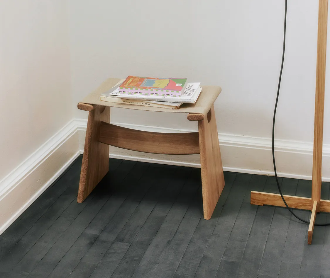 At first glance, the solid oak and canvas stool is a simple design focusing on appearance and material. Still, a closer look reveals that a great deal of care and thought has gone into the design, drawing from historical references and knowledge of the craft. The name Seto refers to the architectural and engineering masterpiece Seto Ōhashi, Japan’s longest bridge connecting the main islands of Honshu and Shikoku. The bridge’s graceful profile is evident in Takeuchi’s stool with its distinctive H-structure, creating a refined and contemporary design.