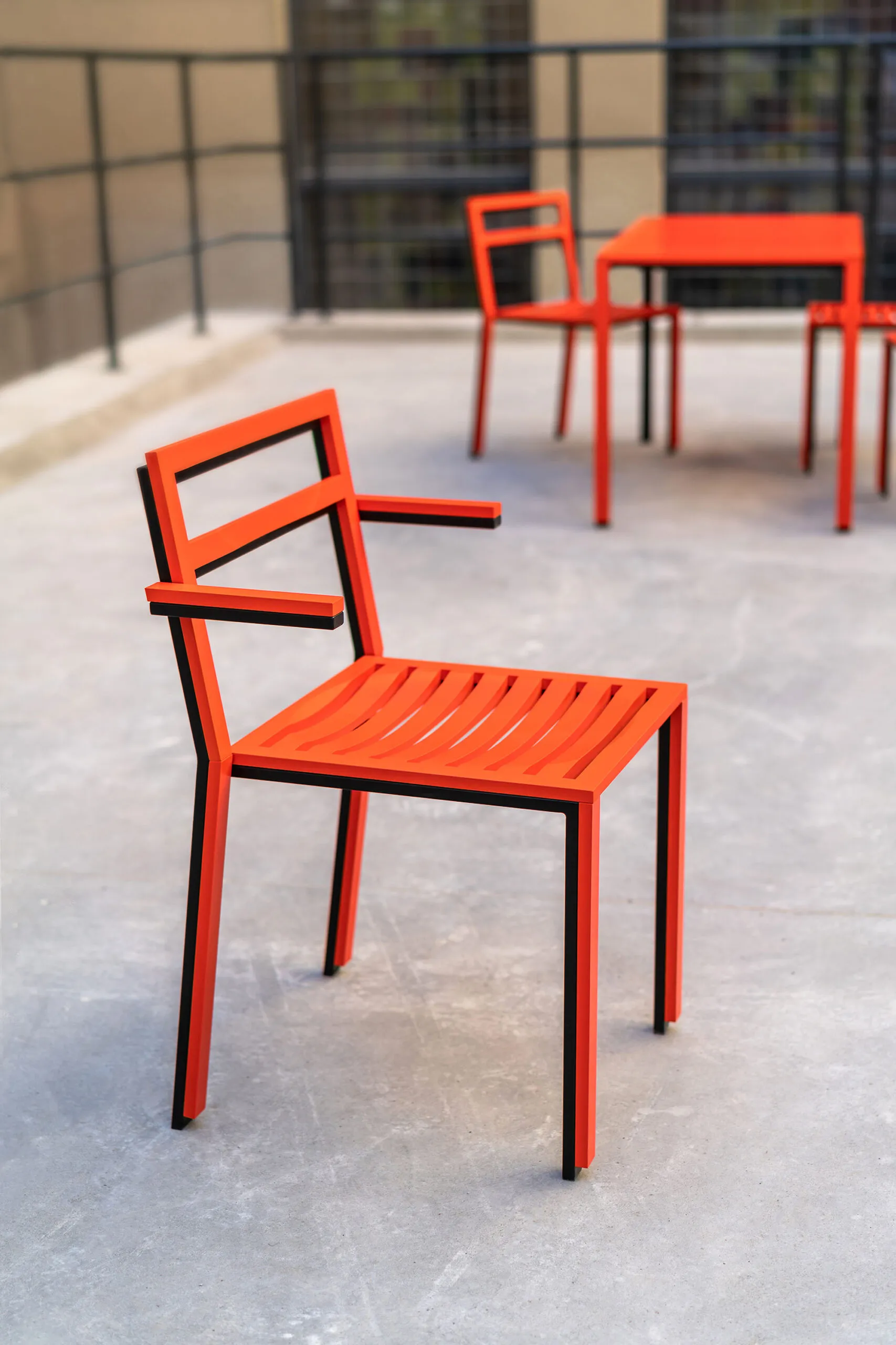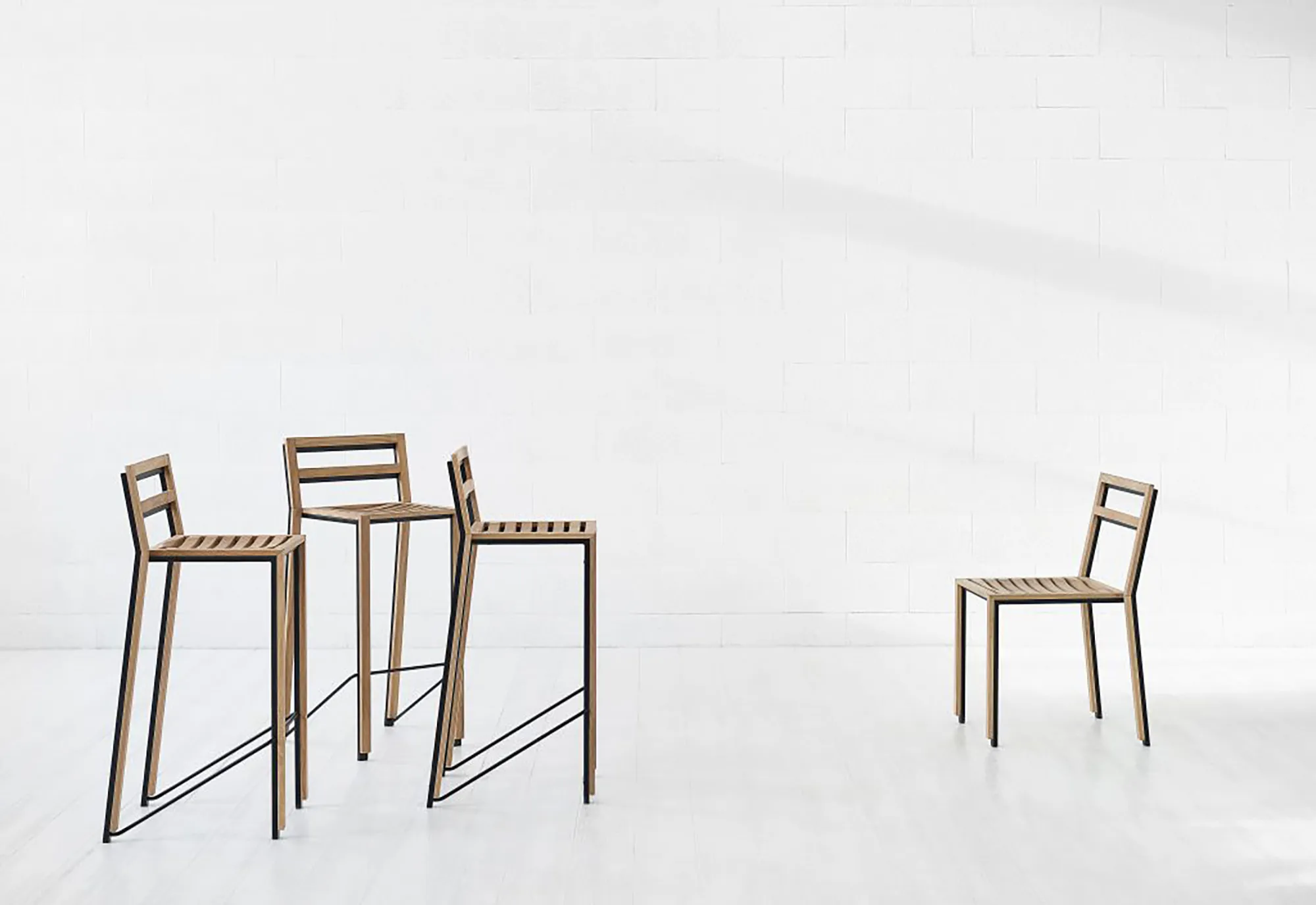 A slender wooden chair, simple as a pictogram stacked on the slender metal frame repeating the shape of the wooden one as its own shadow.