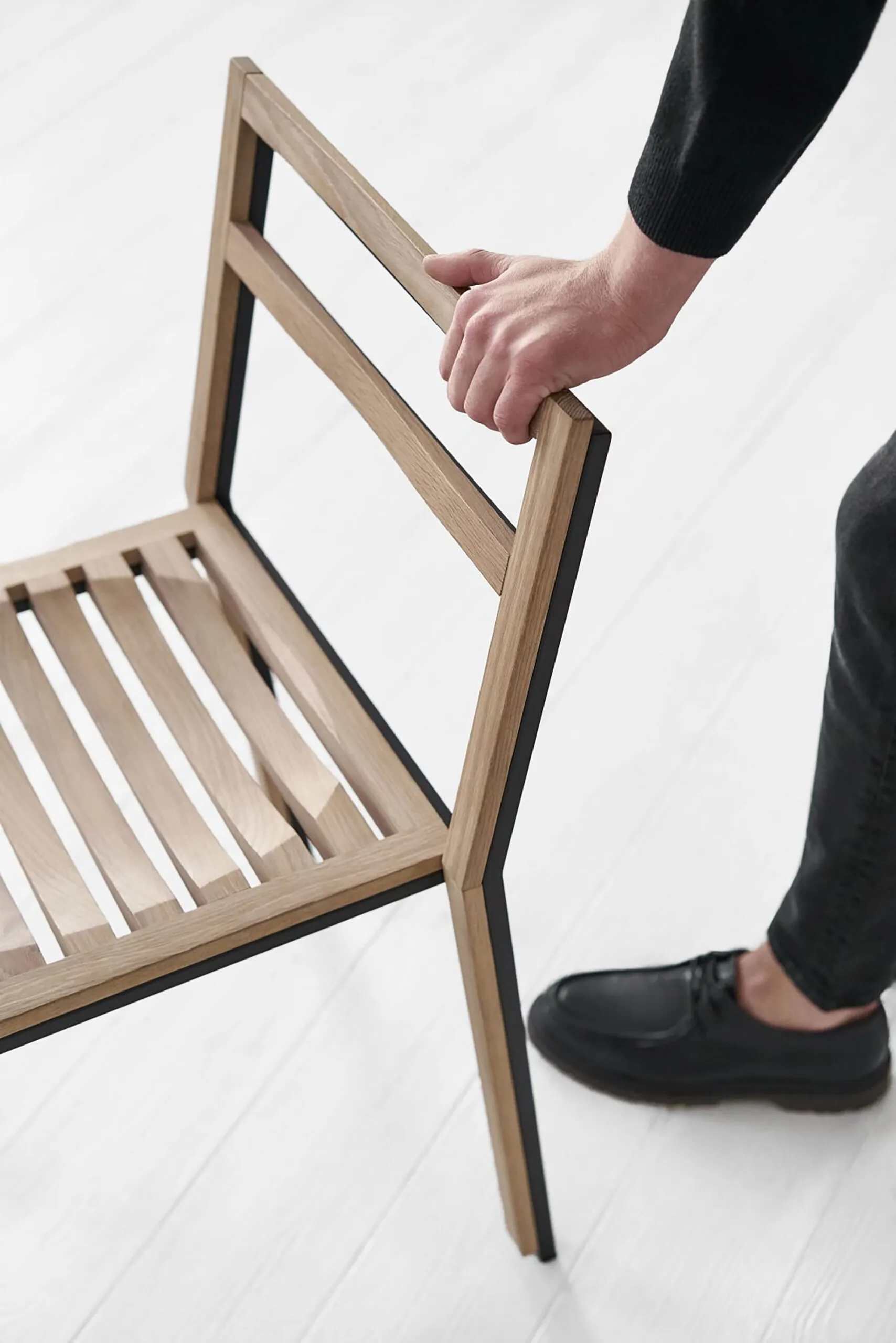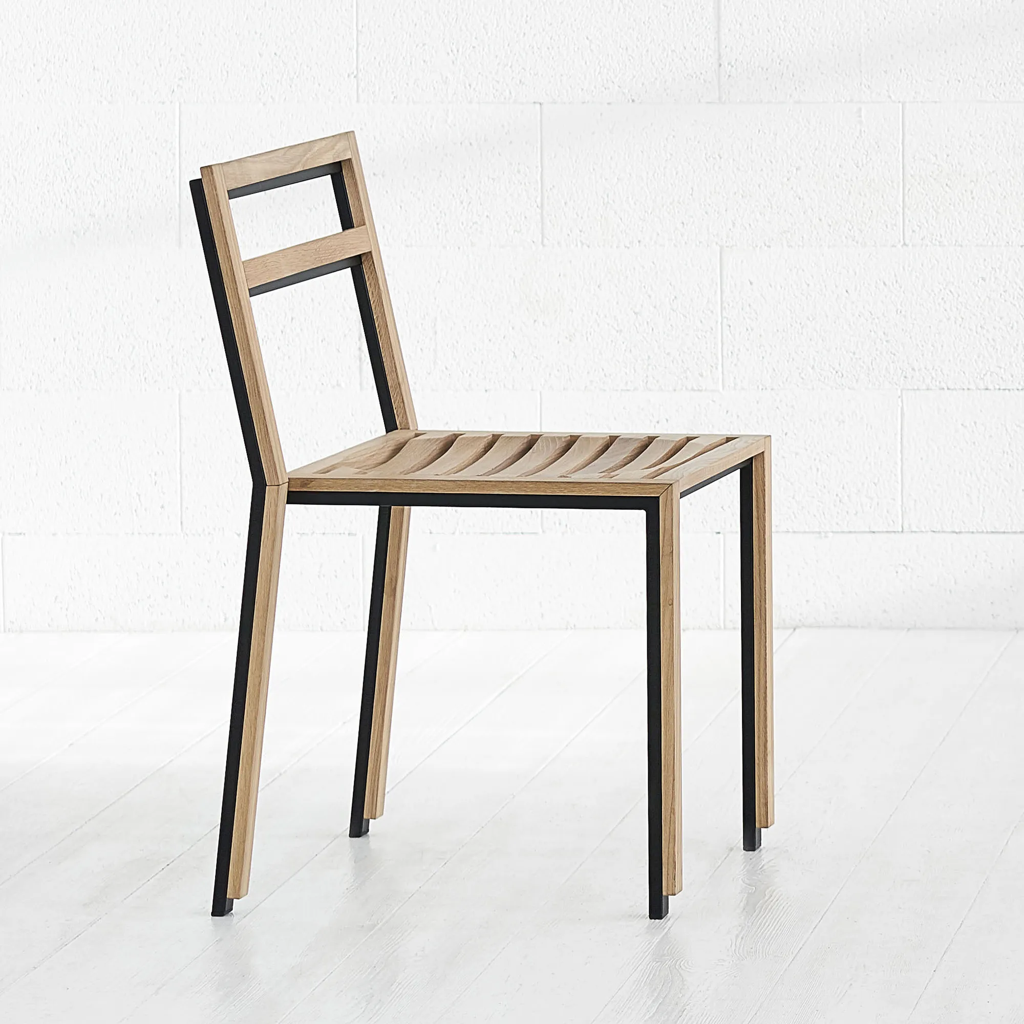 A slender wooden chair, simple as a pictogram stacked on the slender metal frame repeating the shape of the wooden one as its own shadow.